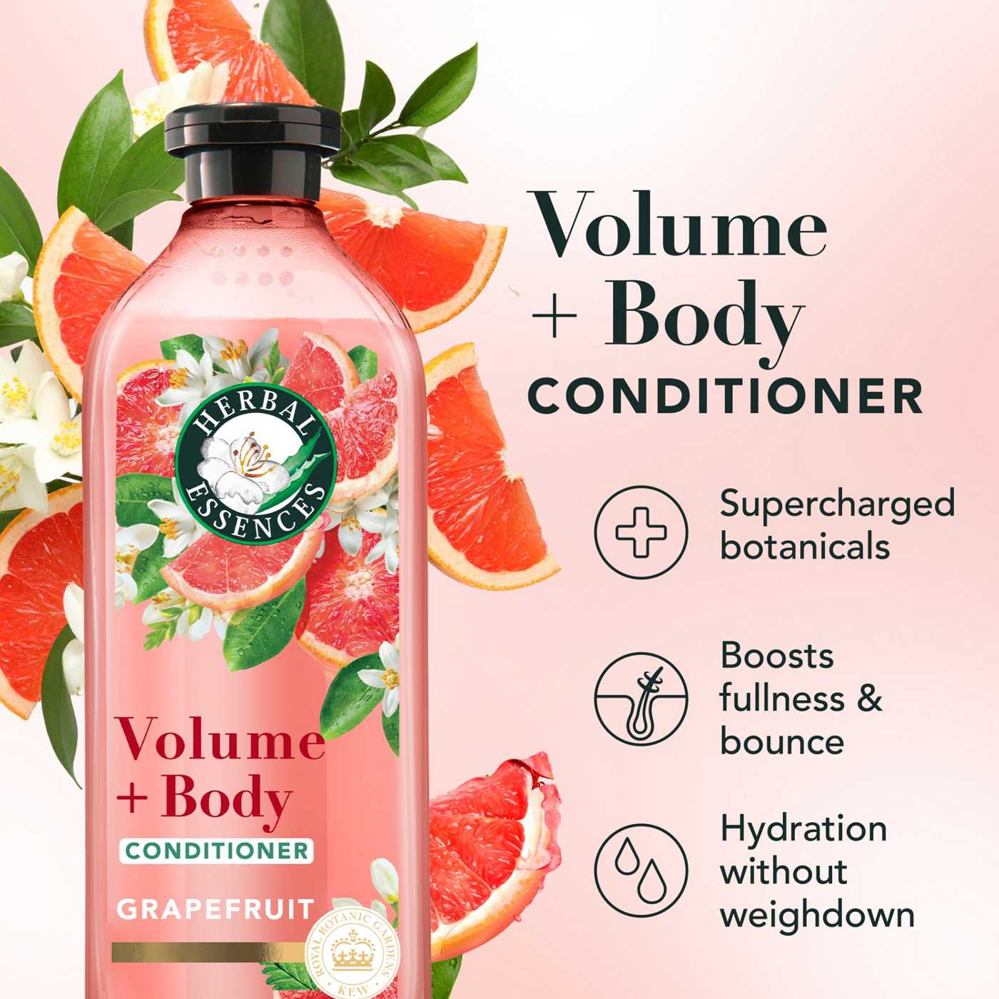 This Herbal Essences conditioner helps add volume to your hair, leaving it looking full and lush. The conditioner has a vibrant and fresh look, with a translucent pink bottle that hints at the refreshing grapefruit scent inside. This paraben-free formula is a gentle option for your daily hair care routine to achieve soft, voluminous hair.• Formulated to add body and lift to fine hair• Lightweight conditioner that rinses clean without weighing hair down• Imparts a refreshing grapefruit scent• Gentle, paraben-free formula suitable for daily use