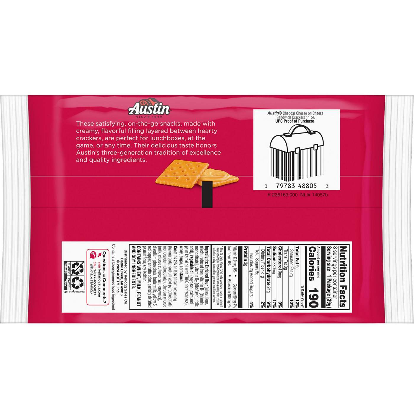 Add a flavorful boost to any snacking occasion with Austin Cheddar Cheese on Cheese sandwich crackers. These crispy, cheesy sandwich crackers are made with an irresistible creamy filling, the craveable taste of cheddar cheese, and a sprinkle of salt. Austin Cheddar Cheese sandwich crackers provide snacking satisfaction for any occasion, whether you're just hanging out around the house or preparing to head out for an exciting excursion like an outdoor concert, while you're hiking or camping, or during game time. Our crackers are conveniently packaged to fit your non-stop lifestyle, making it easier than ever to pack a snack for all kinds of busy, on-the-go moments. Feel free to add some crackers to a packed lunch, stash them in your tote for a well-deserved break at work, enjoy them during a long commute, or as an effortless snack while running errands.- Made with quality ingredients, Austin Cheddar Cheese sandwich crackers are a tasty, cheesy treat for both kids and adults- Delicious and cheesy filling layered between crispy sandwich crackers for a satisfying salty snack experience- Made with delicious ingredients; Kosher Dairy; Contains wheat, milk, peanut and soy ingredients- Stock your home pantry, keep on hand at the office, and stow in a lunchbox, backpack, or tote bag; A travel-ready food- Includes 1, 11-ounce pack with 8, 1.38-ounce packages of sandwich crackers; Packaged for freshness and great taste- SNAP and EBT eligible item