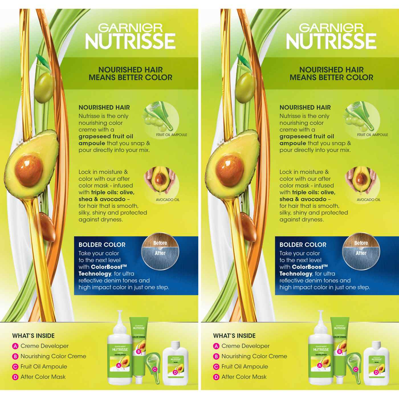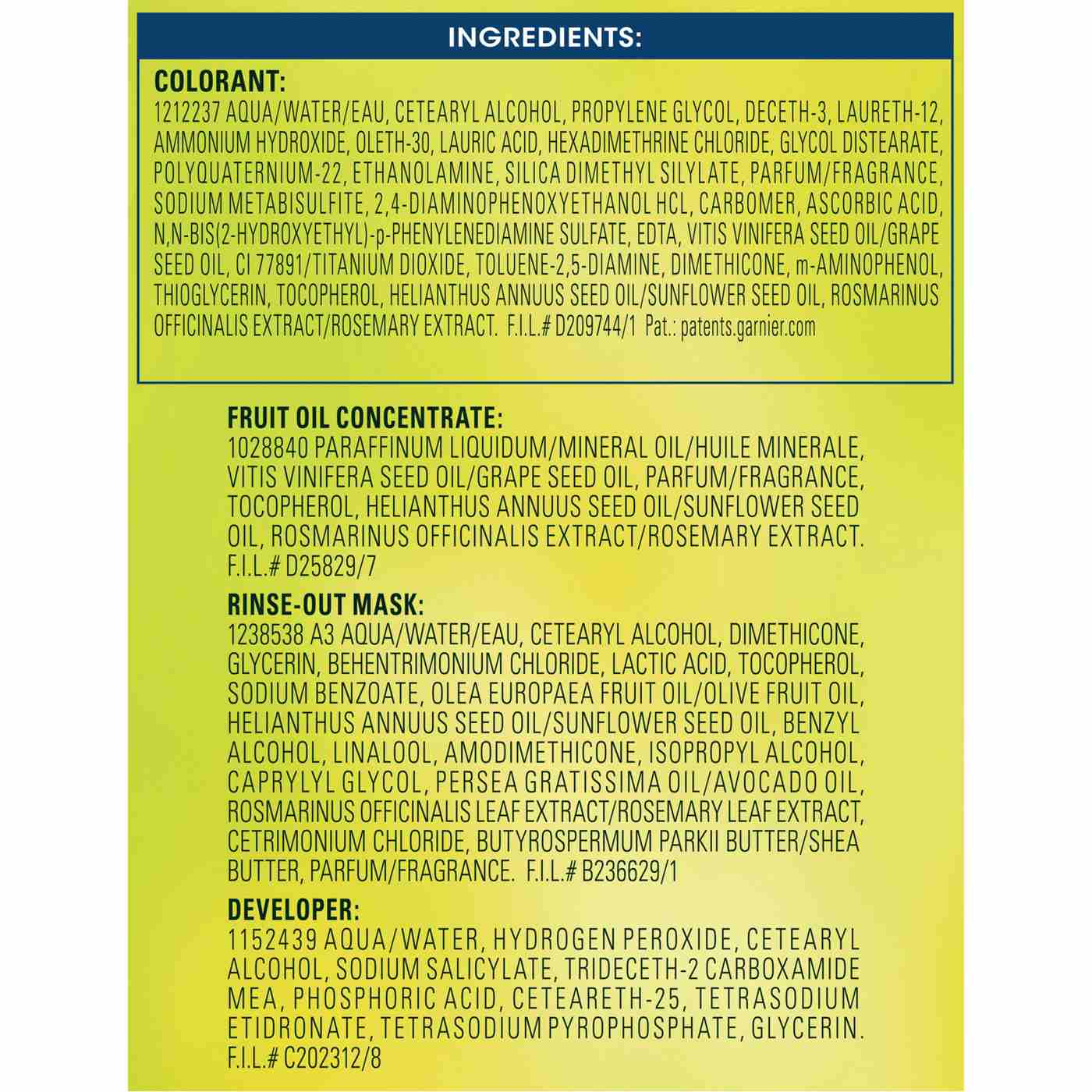 Colorant: 1200613 D Aqua/Water/Eau, Cetearyl Alcohol, Propylene Glycol, Deceth-3, Laureth-12, Ammonium Hydroxide, Oleth-30, Lauric Acid, Hexadimethrine Chloride, Glycol Distearate, Polyquaternium-22, Ethanolamine, Silica Dimethyl Silylate, Ci 77891/Titanium Dioxide, 2,4-Diaminophenoxyethanol Hcl, M-Aminophenol, Ascorbic Acid, Tocopherol, Sodium Metabisulfite, Thioglycerin, Toluene-2,5-Diamine, Helianthus Annuus Seed Oil/Sunflower Seed Oil, Dimethicone, Pentasodium Pentetate, N,N-Bis(2-Hydroxyethyl)-P-Phenylenediamine Sulfate, Parfum/Fragrance, Carbomer, Rosmarinus Officinalis (Rosemary) Extract, Vitis Vinifera Seed Oil/Grape Seed Oil. F.I.L.# D193563/2 Fruit Oil Concentrate: 1028840 Paraffinum Liquidum/Mineral Oil/Huile Minerale, Vitis Vinifera Seed Oil/Grape Seed Oil, Parfum/Fragrance, Tocopherol, Rosmarinus Officinalis (Rosemary) Extract. F.I.L.# D25829/5 Rinse-Out Conditioner: 1100858 Aqua/Water/Eau, Cetearyl Alcohol, Elaeis Guineensis Oil / Palm Oil , Behent Rimonium Chloride, Pyrus Malus Extract/Apple Fruit Extract, Glycerin, Parfum/Fragrance, Isopropyl Alcohol, Stearamidopropyl Dimethylamine, Niacinamide, Pyridoxine Hcl, Butyrospermum Parkii Butter/Shea Butter, Citric Acid, Olea Europaea Oil/Olive Fruit Oil, Saccharum Officinarum Extract/Sugar Cane Extract/Extrait De Canne A Sucre, Benzyl Alcohol, Chlorhexidine Dihydrochloride, Persea Gratissima Oil/Avocado Oil, Ribes Nigrum Oil/Black Currant Seed Oil, Linalool, Phenoxyethanol, Citrus Medica Limonum Peel Extract/Lemon Peel Extract, Ci 19140/Yellow 5, Camellia Sinensis Leaf Extract, Ci 15985/Yellow 6, Tocopherol, Glycine Soja Oil/Soybean Oil. F.I.L.# D174455/3 Developer: 178914 U Aqua /Water/ E Au, Hydrogen Peroxide, Ce Te Aryl Alcohol, Trideceth-2 Carboxamide Mea, Ceteareth-25, Glycerin, Pentasodium Pentetate, Sodium Stannate, Tetrasodium Pyrophosphate, Phosphoric Acid. F.I.L.# D12836/26Allergens and safety warnings