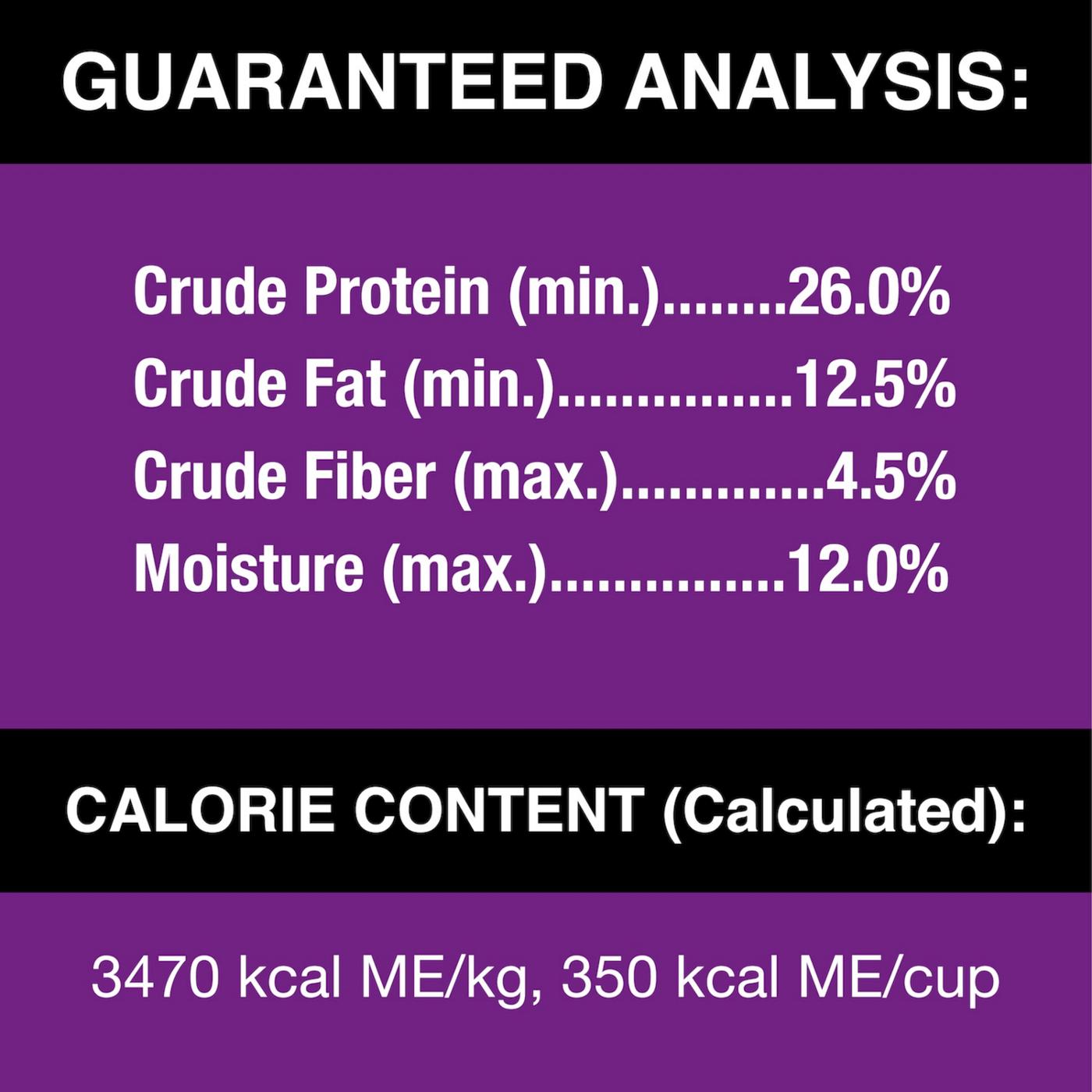 Nutrients: Crude Protein min 26.0 %; Crude Fat min 12.5 %; Crude Fiber max 4.5 %; Moisture max 12.0 %.
