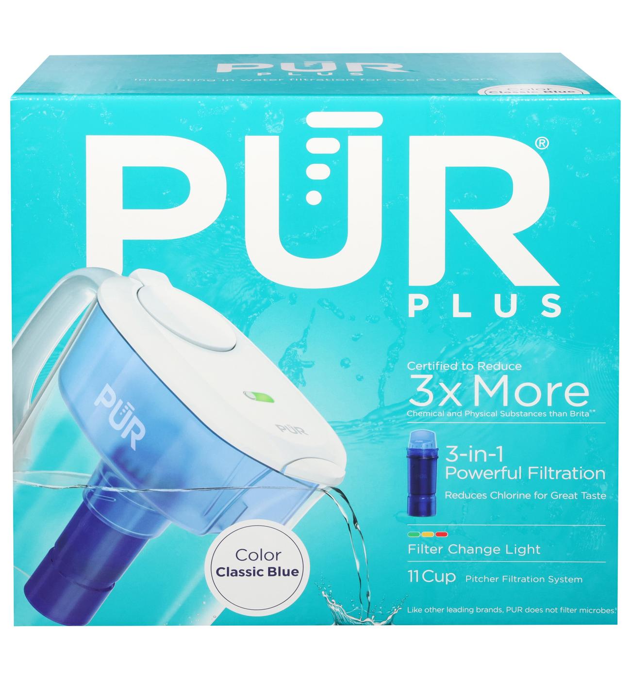Quickly and easily enjoy cleaner, filtered water in your fridge with the PUR PLUS 11 Cup Pitcher Filtration System. This water filter pitcher features an easy-fill, stay-tight lid and a Filter Change Light to indicate filter status. Tap water may look clean, but can contain pollutants and contaminants from traveling through pipes. PUR PLUS pitcher water filters reduce contaminants like lead.