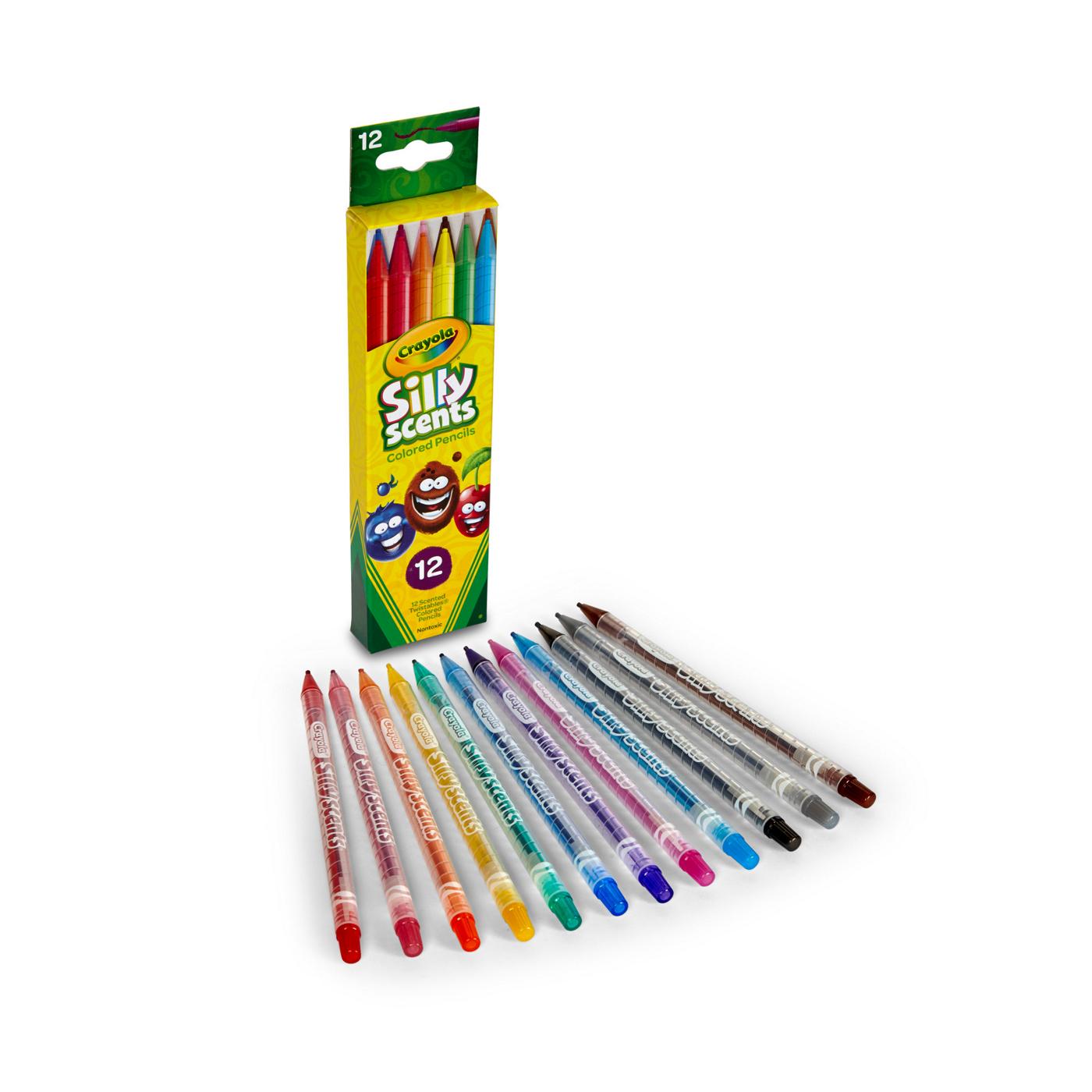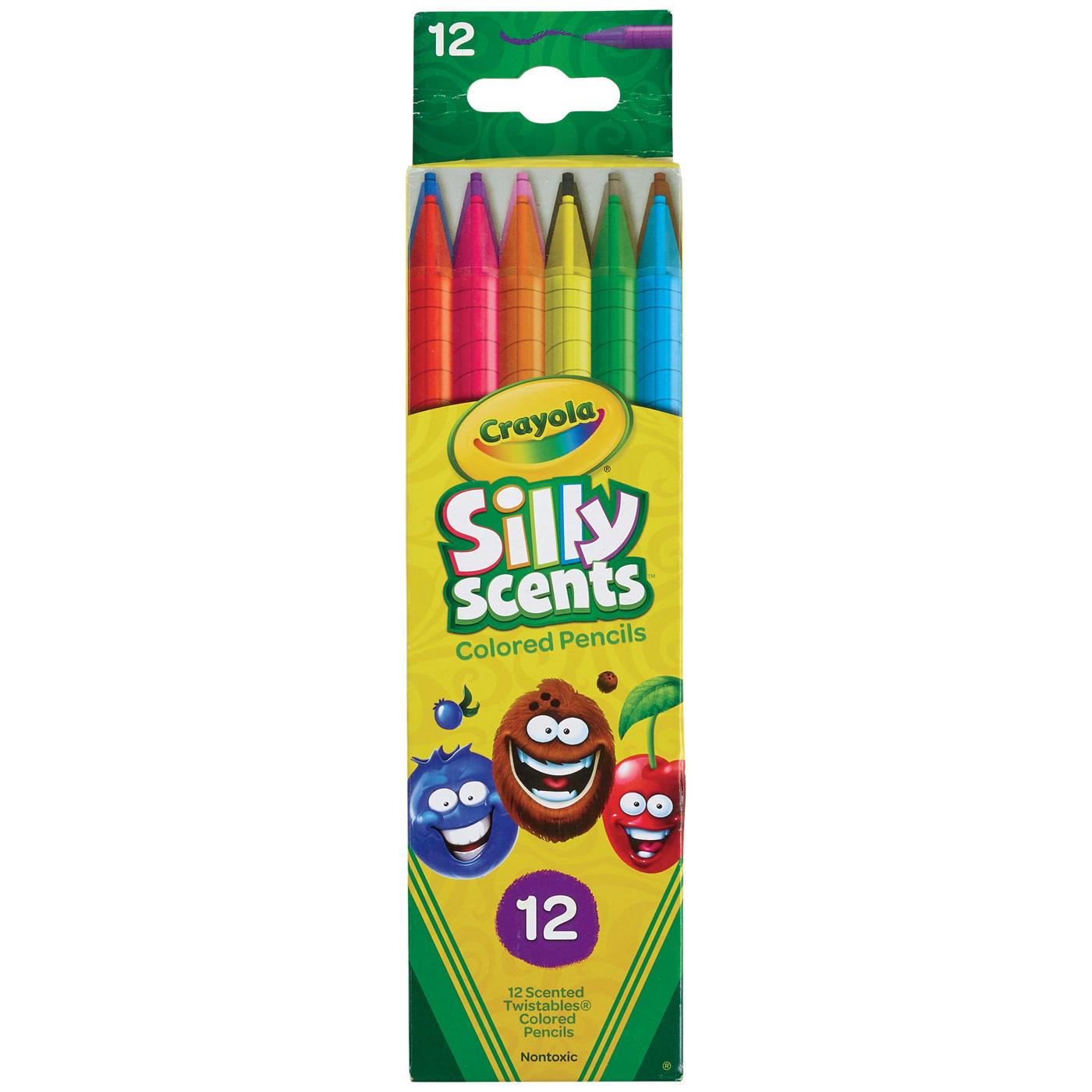 Crayola®, Silly Scents combines fragrant scents in a cool, colorful line of crayons, markers and colored pencils! Each aromatic art tool comes ready to scribble and sniff. The 12 pack of Twistables®, Colored Pencils includes Cherry, Fruit Punch, Orange, Green Apple, Ocean, Blueberry, Grape, Cotton Candy, Licorice, Coconut, Root Beer and introducing, Pineapple! Twistables®, never need sharpening just twist to advance the pencil core. Comes in a delightful character pack.