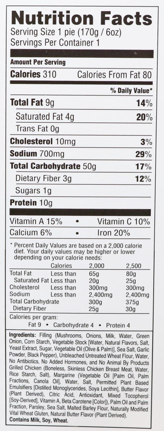 Filling (Mushrooms, Onions, Milk, Water, Green Onion, Food Starch Modified, Vegetable Stock [Water, Natural Flavors, Salt, Yeast Extract, Sugar, Vegetable Oil (Oil and Palm)], Sea Salt, Garlic Powder, Black Pepper), Unbleached Untreated Wheat Flour, Water, Grilled Chicken** (Boneless, Skinless Chicken Breast Meat, Water, Rice Starch, Salt), Margarine (Vegetable Oil [Palm Oil, Palm Fractions, Canola Oil], Water, Salt, Permitted Plant Based Emulsifiers [Distilled Monoglycerides, Soya Lecithin], Butter Flavor (Plant Derived), Citric Acid, Antioxidant, Mixed Tocopherol [Soy-Derived], Vitamin A, Beta Carotene [Color], Palm Oil and Palm Fraction, Parsley, Sea Salt, Malted Barley Flour, Naturally Modified Vital Wheat Gluten, Natural Butter Flavor (Plant Derived).