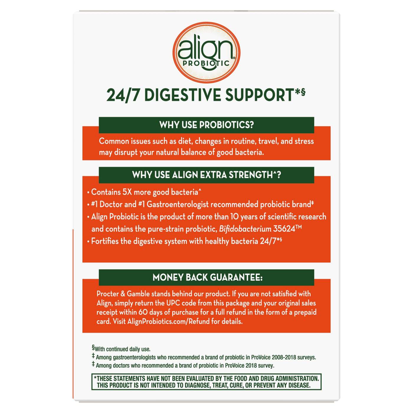 THE PROBIOTIC BRAND DOCTORS RECOMMEND MOST. Recommended by Gastroenterologists two times more than any other probiotic brand, Align is the #1 doctor and gastroenterologist recommended probiotic brand. Align Extra Strength^ is a daily probiotic supplement that helps maintain your natural digestive balance by adding 5x more^ good bacteria to your gut.* Align Extra Strength^ Probiotic contains the unique probiotic strain Bifidobacterium 35624, which was developed by gastroenterologists and backed by 20+ years of scientific research. Align Extra Strength^ Probiotic is vegetarian, gluten-free, and does not require refrigeration.