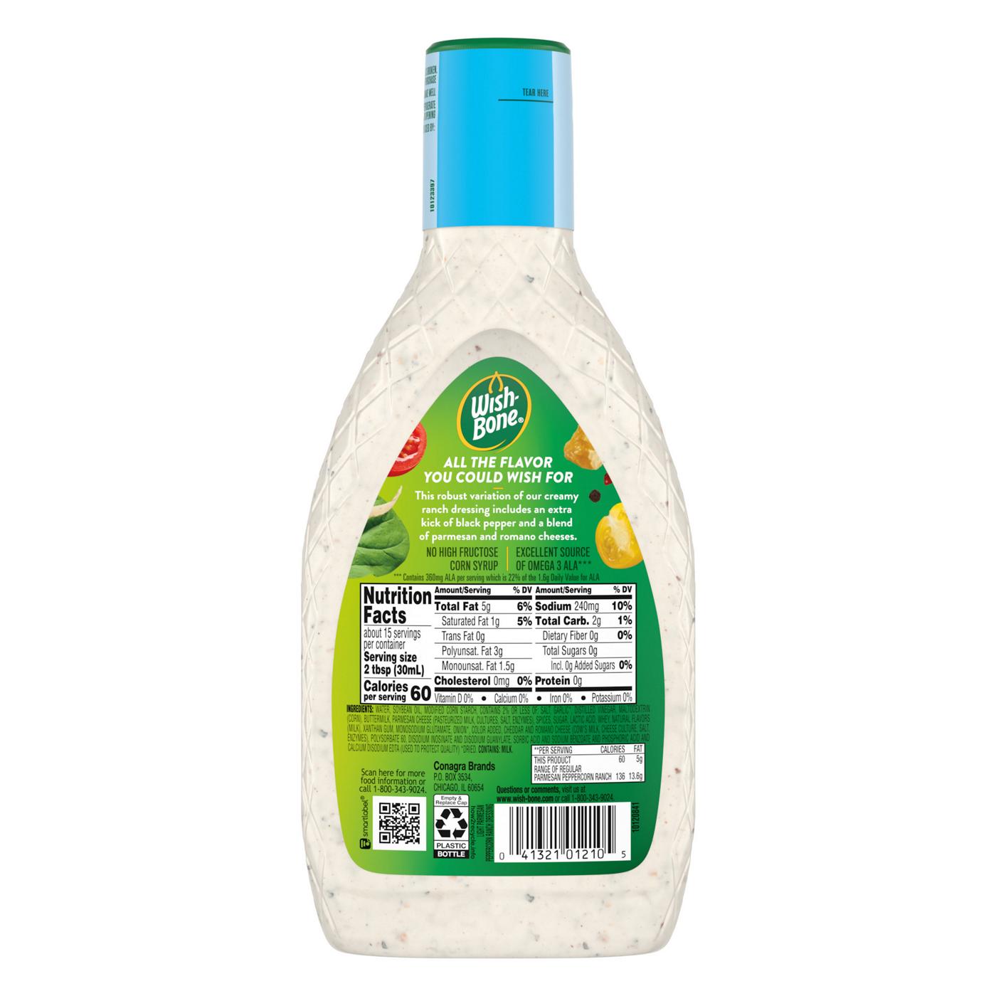 Wish-Bone Light Parmesan Peppercorn Ranch Dressing adds robust flavor to all your favorite dishes. Made with a unique blend of creamy ranch dressing, black pepper, and Parmesan and Romano cheeses, this light ranch dressing adds bold flavor to salads, sandwiches and more. Wish-Bone's light peppercorn ranch salad dressing contains 1/3 fewer calories and 1/2 the fat of a range of regular Parmesan peppercorn ranch dressings (this product has 60 calories and 5 grams of fat per serving vs. 136 calories and 13.6 grams of fat for a range of regular Parmesan peppercorn ranch dressings). This light dressing is made without high fructose corn syrup and contains no artificial flavors. Use this Parmesan peppercorn salad dressing as a dip, or top fresh salad greens. A 15 fluid ounce squeeze salad dressing bottle makes it easy to dispense the perfect amount. Refrigerate the dressing after opening. From savory ranch dressings to robust Italian, Wish-Bone has what you need to make your dishes amazing.