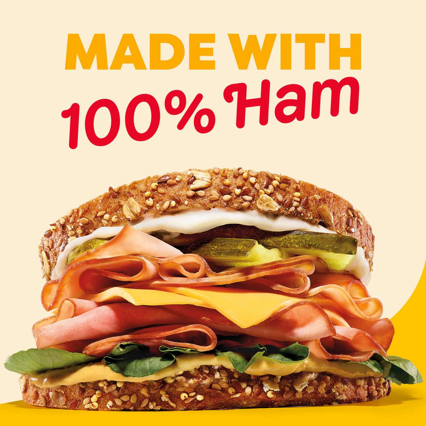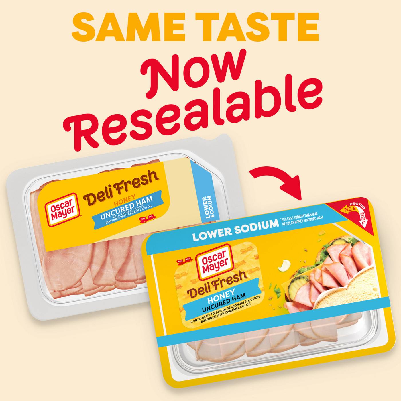 Make a delicious deli sandwich at home with Oscar Mayer Deli Fresh Honey Uncured Ham with Natural Juices Browned with Caramel Color Sliced Lunch Meat with 27% Lower Sodium. Our quality honey ham deli meat contains 27% less sodium than USDA data for cooked smoked honey ham and is made with no artificial preservatives*, no added hormones, and no added nitrates or nitrites except those naturally occurring in cultured celery juice. Fully cooked and ready to eat, our uncured ham slices have a mouthwatering sweet flavor with a touch of honey that's perfect for a sandwich, salad, or cheese and crackers. Keep our 8-ounce package of deli ham refrigerated to maintain freshness. If you enjoy our honey deli ham, be sure to try the other varieties of Oscar Mayer ham lunch meat. *see back panel for ingredients used to support quality.• One 8 oz tray of Oscar Mayer Deli Fresh Honey Uncured Ham with Natural Juices Browned with Caramel Color Sliced Lunch Meat with 27% Lower Sodium than USDA data for cooking smoked honey ham, 8 oz tray.• Oscar Mayer Deli Fresh Honey Uncured Ham with Natural Juices Browned with Caramel Color Sliced Lunch Meat with 27% Lower Sodium than USDA data for cooking smoked honey ham.• Contains 27% less sodium than USDA data for cooked smoked honey ham• Honey uncured ham with Natural Juices Browned with Caramel Color lunch meat has no artificial preservatives and no added nitrates or nitrites except those naturally occurring in cultured celery juice.• Our sliced ham is sweetened with a touch of honey• Honey ham slices are fully cooked and ready to eat• Add a few slices of honey ham lunch meat to sandwiches, wraps, deli platters, salads, or cheese and crackers• So many ways to keep it Oscar with our wide range of cold cuts, bacons, hot dogs and meat snack plates• SNAP & EBT eligible food item
