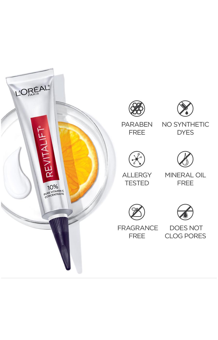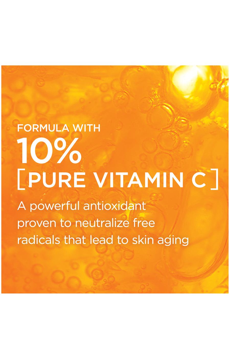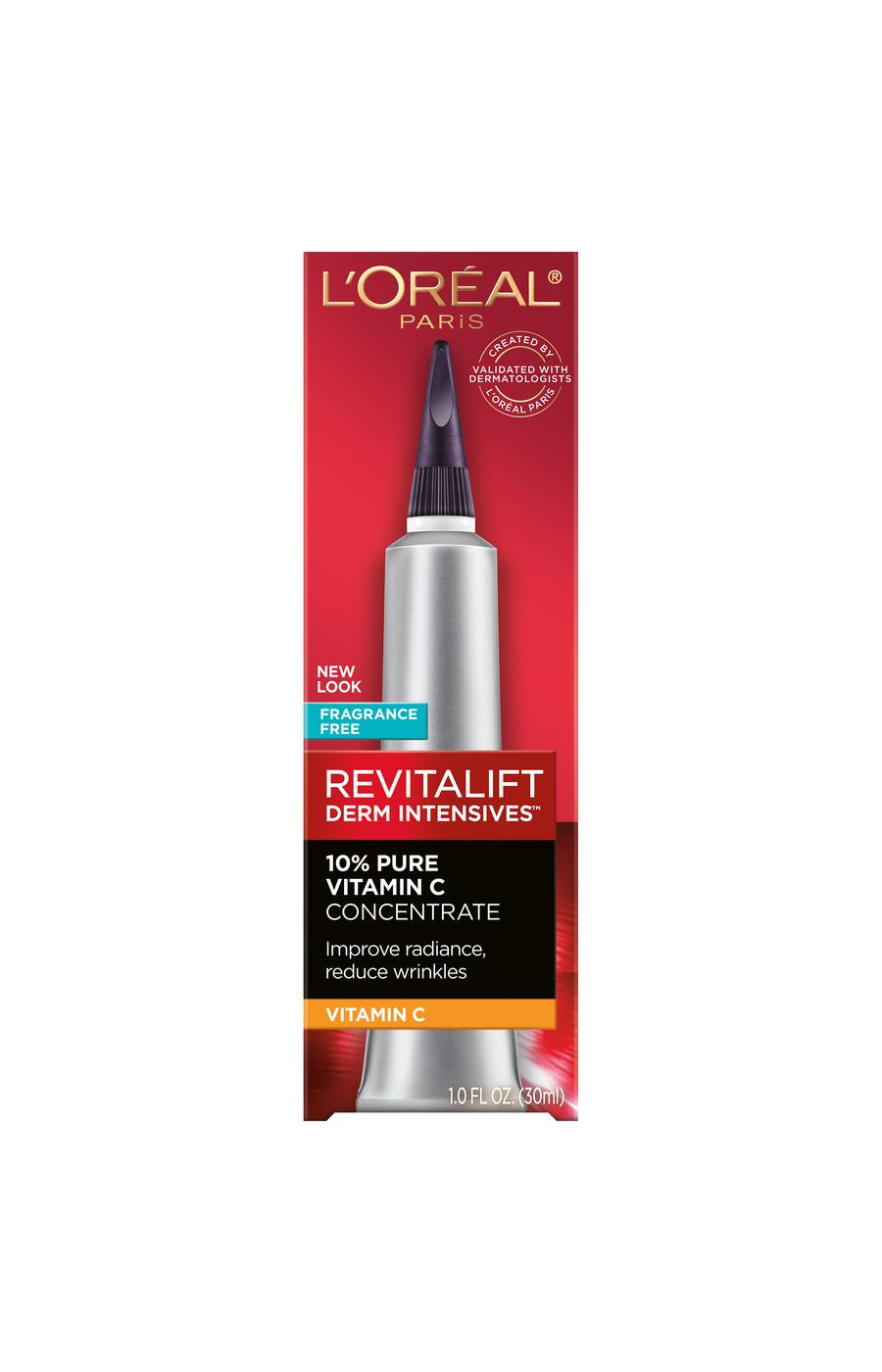 10 percent Pure Vitamin C Serum with Hyaluronic Acid,Vitamin C cream formula to improve skin radiance and visibly reduce wrinkles,Visibly brighten skin in 1 week and reduce fine lines in 2 weeks,In 4 weeks wrinkles, dark spots, pores are visibly reduced,VISIBLY IMPROVE RADIANCE AND REDUCE WRINKLES. Revitalift 10% Pure Vitamin C Serum is a potent and dermatologist-validated serum that visibly brightens skin in 1 week, improves fine lines and uneven tone in 2 weeks, and visibly reduces wrinkles, dark spots and pores in 4 weeks. Our Vitamin C cream formula is infused with Hyaluronic Acid for added hydration to make the skin look radiant and more youthful. WHAT IS VITAMIN C? Vitamin C is a vital antioxidant naturally found in skin and recommended by dermatologists to boost radiance, brighten skin, and neutralize free radicals that may lead to visible signs of aging. WHY CHOOSE PURE VITAMIN C? Our 10% Pure Vitamin C Serum is formulated with a potent and effective concentration for optimal absorption and efficacy. To stabilize the formula, the serum is formulated without water and protected in an innovative air-tight metal tube to minimize UV and oxygen exposure. It is potent and effective from the first drop to the last - giving you powerful anti-aging results with continued use. DERM-VALIDATED FOR MAXIMAL EFFICACY AND SAFETY. Our ultra lightweight, fragrance-free formula is tested on all skin types, does not clog pores, and is free of parabens, mineral oils and synthetic dyes. APPLICATION: Every AM and PM, smooth a pea size onto face while avoiding the eye area. DISCOVER OUR DERM INTENSIVES SERUMS. Check out other Revitalift Derm Intensives Serums from the #1 SERUM BRAND IN AMERICA* to pair for best results. Pair with 1.5% PURE Hyaluronic Acid Serum in the AM for visibly plumped and youthful looking skin. Pair with 0.3% PURE Retinol Night Serum in the PM for visibly reduced wrinkles and smooth texture. For extra hydration and sun protection, pair with Triple Power Fragrance-Free Moisturizer and Triple Power SPF 30 Lotion.