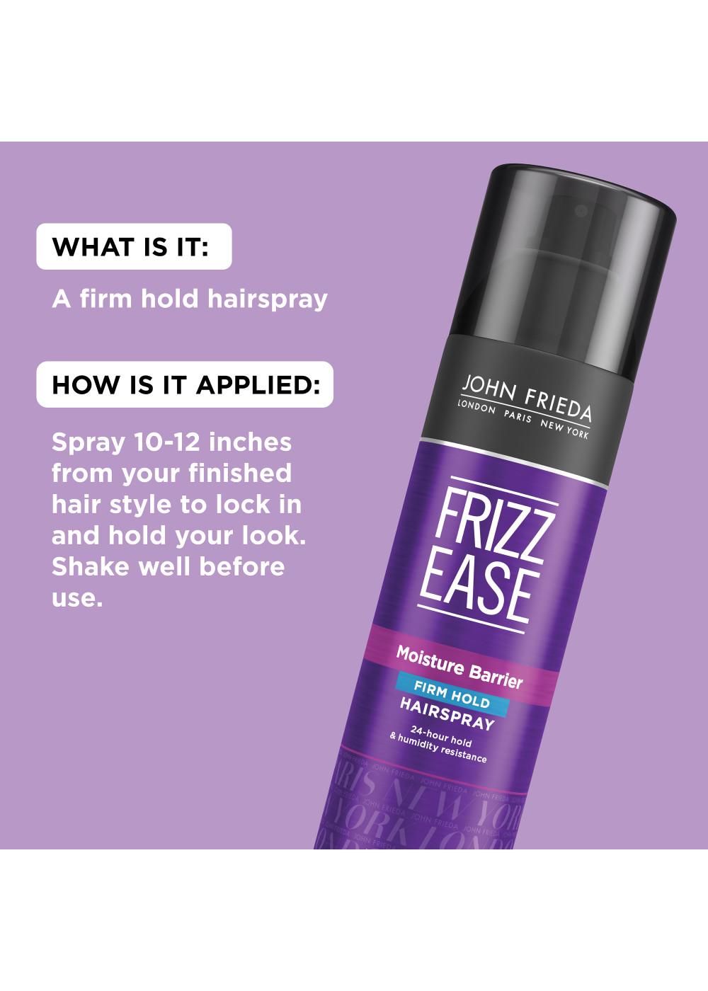 John Frieda Frizz Ease Moisture Barrier Firm Hold Hairspray locks in style, but locks out humidity for up to 24 hours. This quick-drying, strong-hold hairspray is dispensed in a firm mist to help create a solid barrier around hair, sealing out style-ruining moisture while keeping your locks frizz-free and in place. It dries quickly, boosts shine, and has a lightweight texture. Help keep your hair protected, rain or shine.
