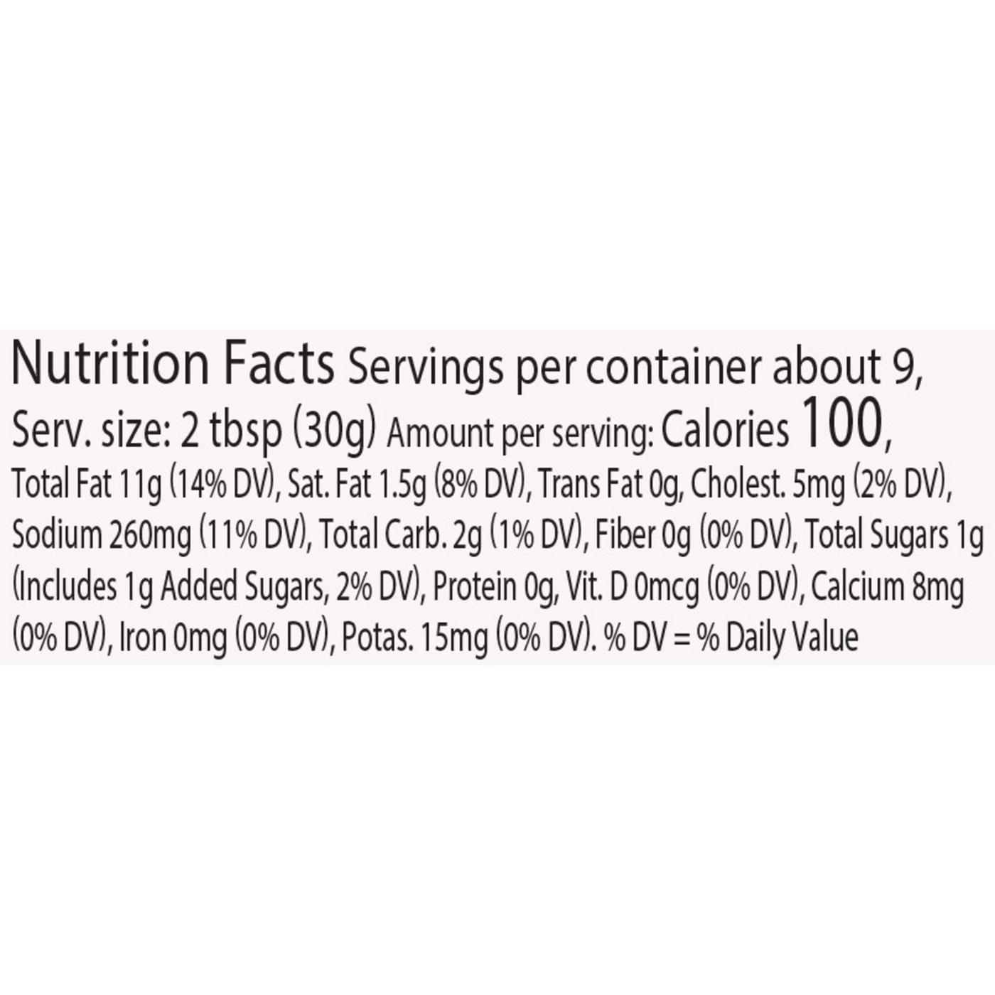 Water, Vegetable Oil (Soybean and/or Canola), Buttermilk, Sugar, Salt, Modified Food Starch, Egg Yolk, Natural Flavors, Less Than 1% of: Spices, Garlic*, Onion*, Xanthan Gum, Vinegar, Phosphoric Acid, Monosodium Glutamate, Artificial Flavors, With Sorbic Acid, Nisin Preparation, Calcium Disodium EDTA and Rosemary Extract Added to Preserve Freshness. *Dried. Contains: Egg, Milk, Soy.Allergens and safety warnings