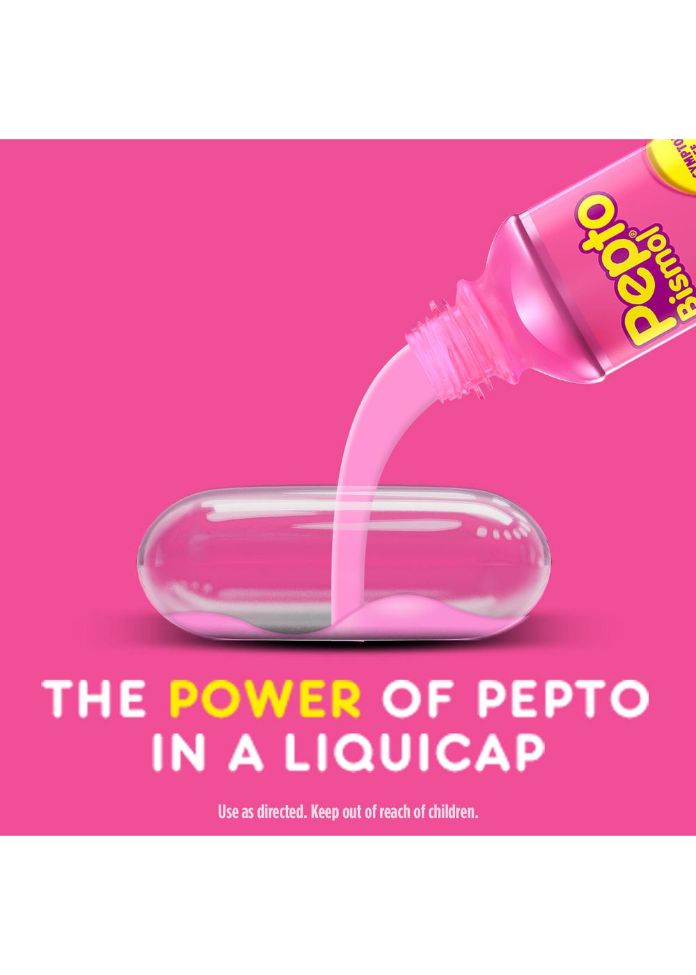 Pepto Bismol LiquiCaps, Fast Relief from Nausea, Heartburn, Indigestion, Upset Stomach, DiarrheaWhen you need upset stomach relief, Pepto Bismol LiquidCaps coats, calms and soothes your stomach, providing fast digestive relief from nausea, heartburn, indigestion, upset stomach, and diarrhea. Convenient and easy to use - Pepto Bismol over-the-counter medicine is formulated to coat your digestive tract to calm and soothe and provide fast and effective 5 symptom relief. The convenient form allows you to take Pepto Bismol on-the-go so you can travel worry-free. Take Pepto Bismol at the first sign of digestive issues so you can get rapid relief. From the maker of the #1 Pharmacist Recommended Upset Stomach Brand - Pepto Bismol.As a part of the P&G family, Pepto Bismol has high quality standards for all our products. Pepto Bismol has been a trusted brand for the treatment of upset stomachs for over 100 years. *May be HSA/ FSA eligible.*Based on Pharmacy Times 2022 Survey-upset stomach remedies category