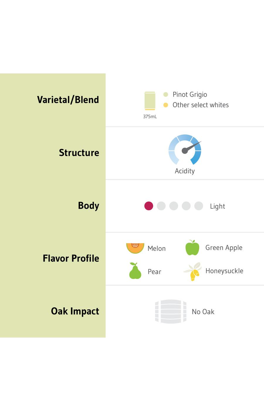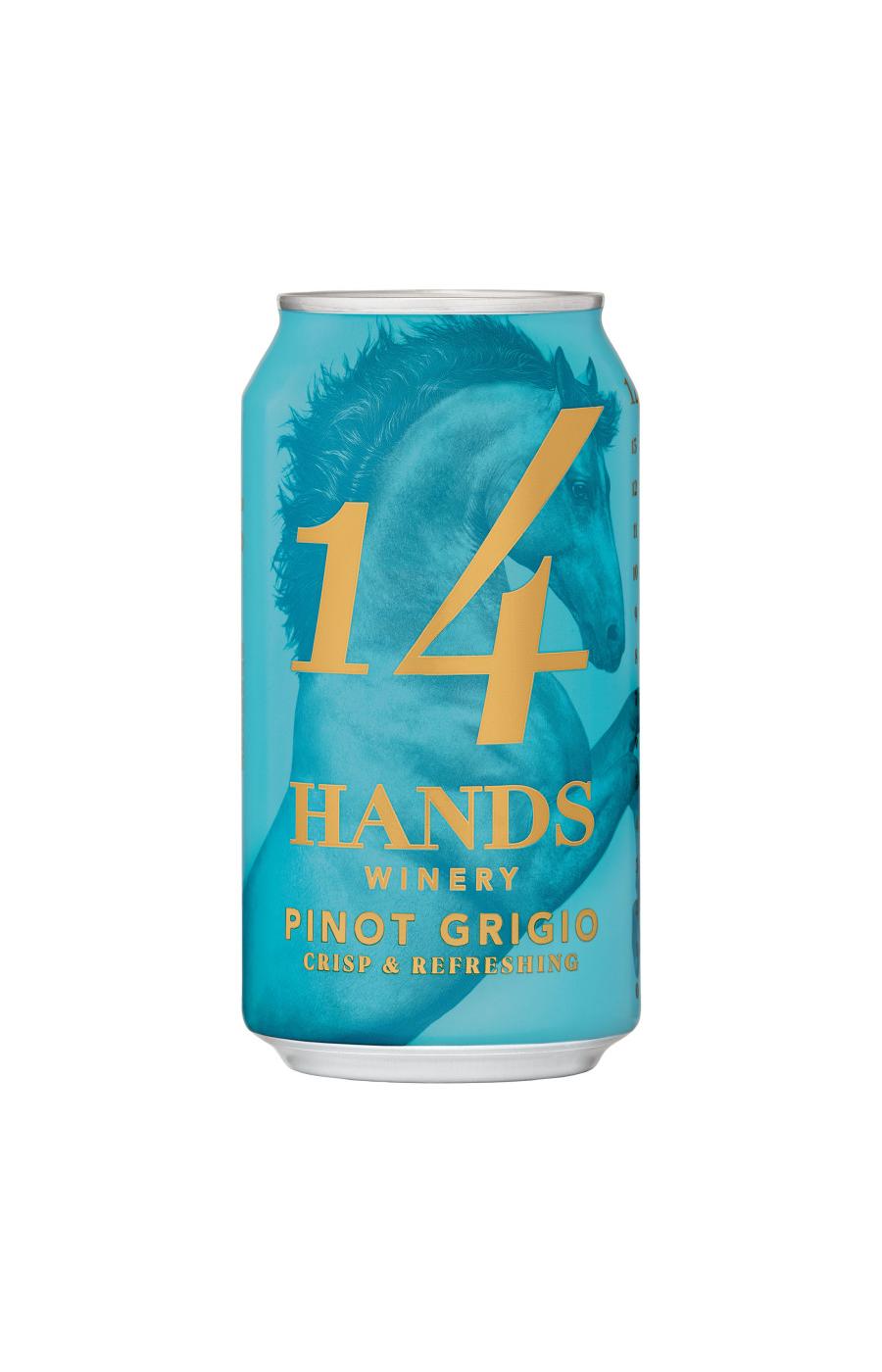 Refreshingly crisp and delightfully smooth, the 14 Hands Pinot Grigio is a canned white wine and the perfect toast to summer adventure. This refreshing Pinot Grigio white wine offers aromas of fresh melon and green apple followed by flavors of pear and honeysuckle. 14 Hands Pinot Grigio is sourced from Washington State with a blend of 97% Pinot Grigio and 3% Chardonnay. Stainless-steel fermentation is used to further enhance the acidity and refreshing quality, making it an ideal pairing to grilled fish, fruit and cheese platters, summer salads and seafood pasta. Our 14 Hands Pinot Grigio white wine is now available in 355 ml Cans. One 355 mL can equals two 6 ounce glasses of wine and has 12.5% ABV.Inspired by the untamed spirit of the wild horses that once freely roamed eastern Washington, 14 Hands wine represents a reconnection to our wild roots and endless thirst for excitement and fun. The loamy sand and gravel soils of the Columbia Valley require a strong and determined grapevine, and our vineyards revel this world-class terroir. With the fruit from these hardy vines, we handcraft big, fruit-forward reds and crisp, juicy whites. Like the untamed horses we honor with our name, our wild and wonderful wines pack a lot of character into each can.