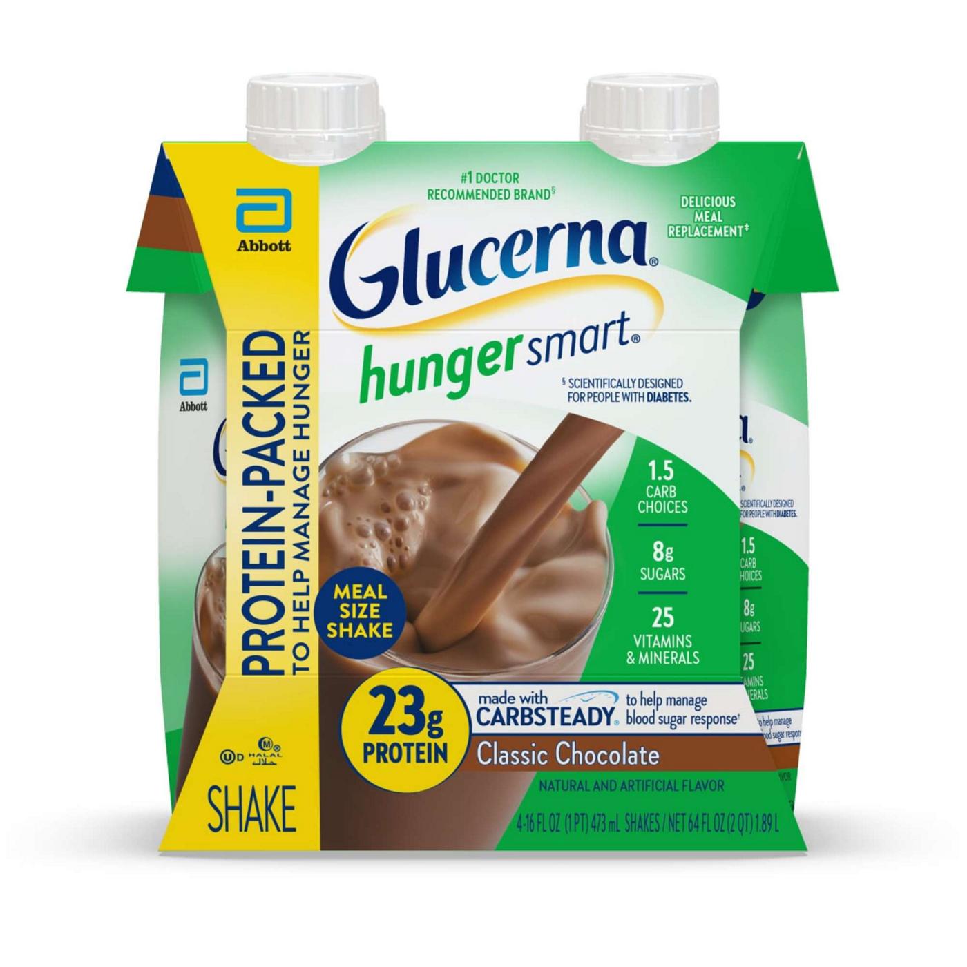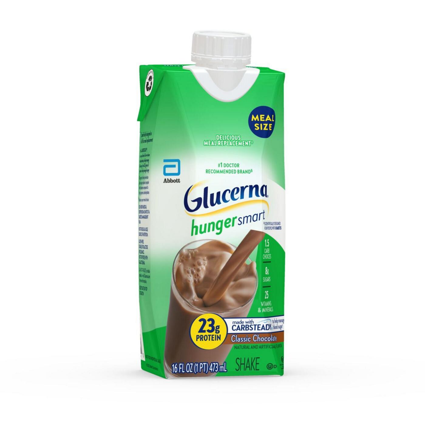 Glucerna Hunger Smart Meal Size Shakes have CARBSTEADY, unique blends of slow-release carbohydrates to help manage blood sugar. Every 16-fl-oz shake has: 23 G of protein, Up to 7 G of fiber, 250 calories