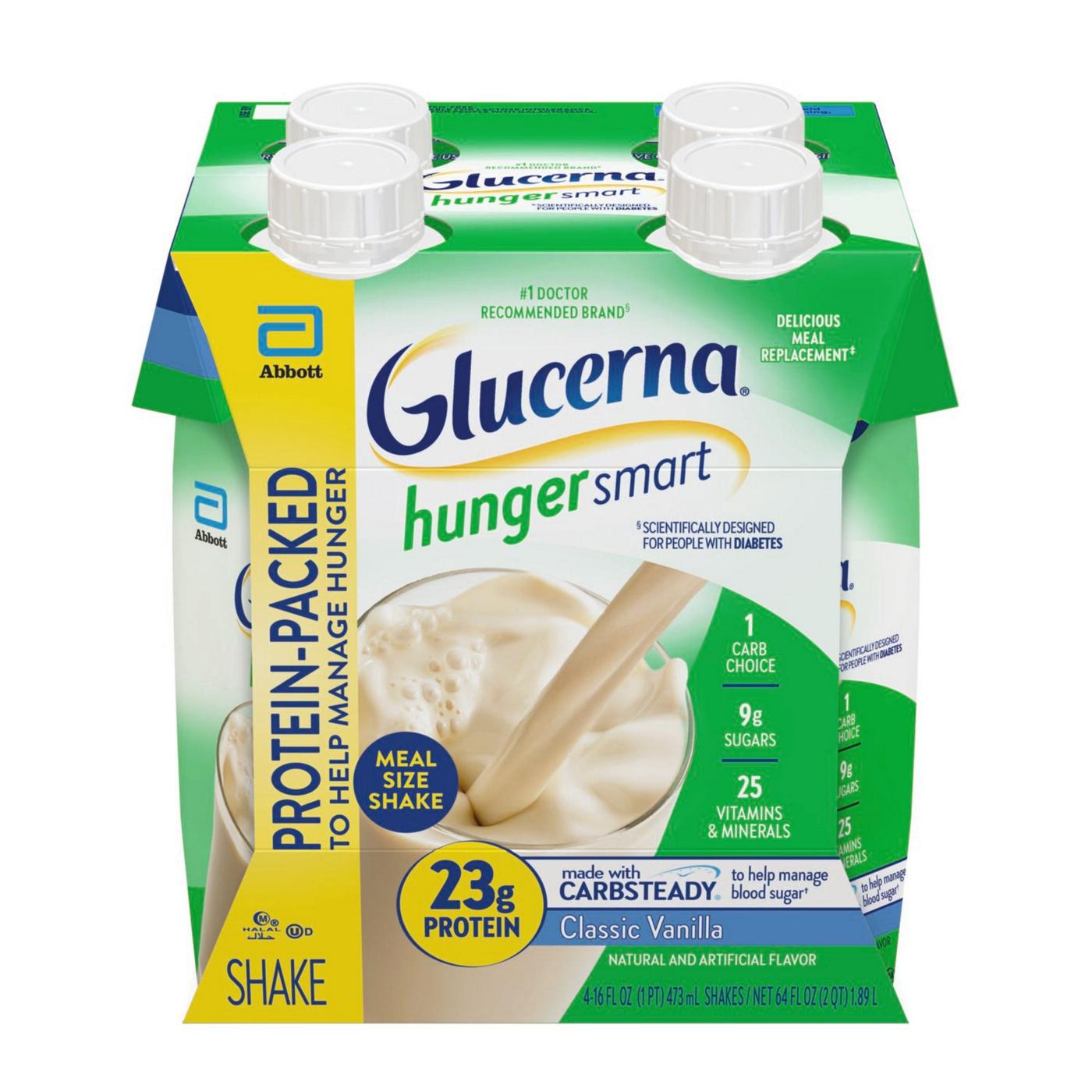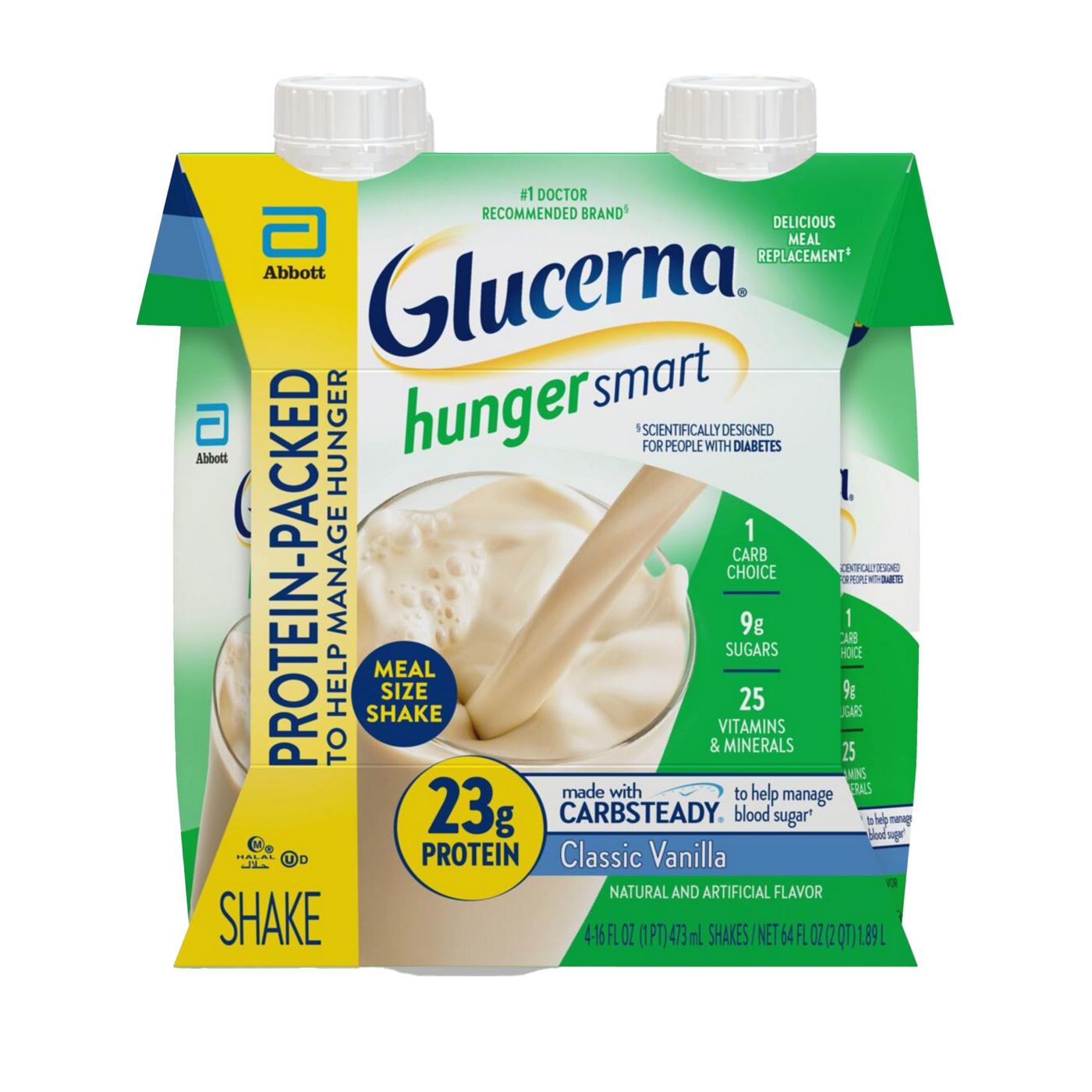 Glucerna Hunger Smart Meal Size shakes are scientifically designed as meal replacements for people withdiabetes. Our meal-size nutrition shakes have CARBSTEADY, unique blends of slow-release carbohydrates to helpminimize blood sugar spikes,* as well as 23g of high-quality protein to help you manage hunger. Each shake containsnutrients for immune system support, like vitamins A & D, zinc, and antioxidants (vitamins C & E). Gluten-free andsuitable for lactose intolerance.‡ Glucerna is the #1 nutrition brand recommended by doctors for people withdiabetes.* Designed to help minimize blood sugar spikes compared to high-glycemic carbohydrates.† The SNAP name is a service mark of the US Department of Agriculture; USDA does not endorse any goods,services, or enterprises.‡ Not suitable for people with galactosemia.
