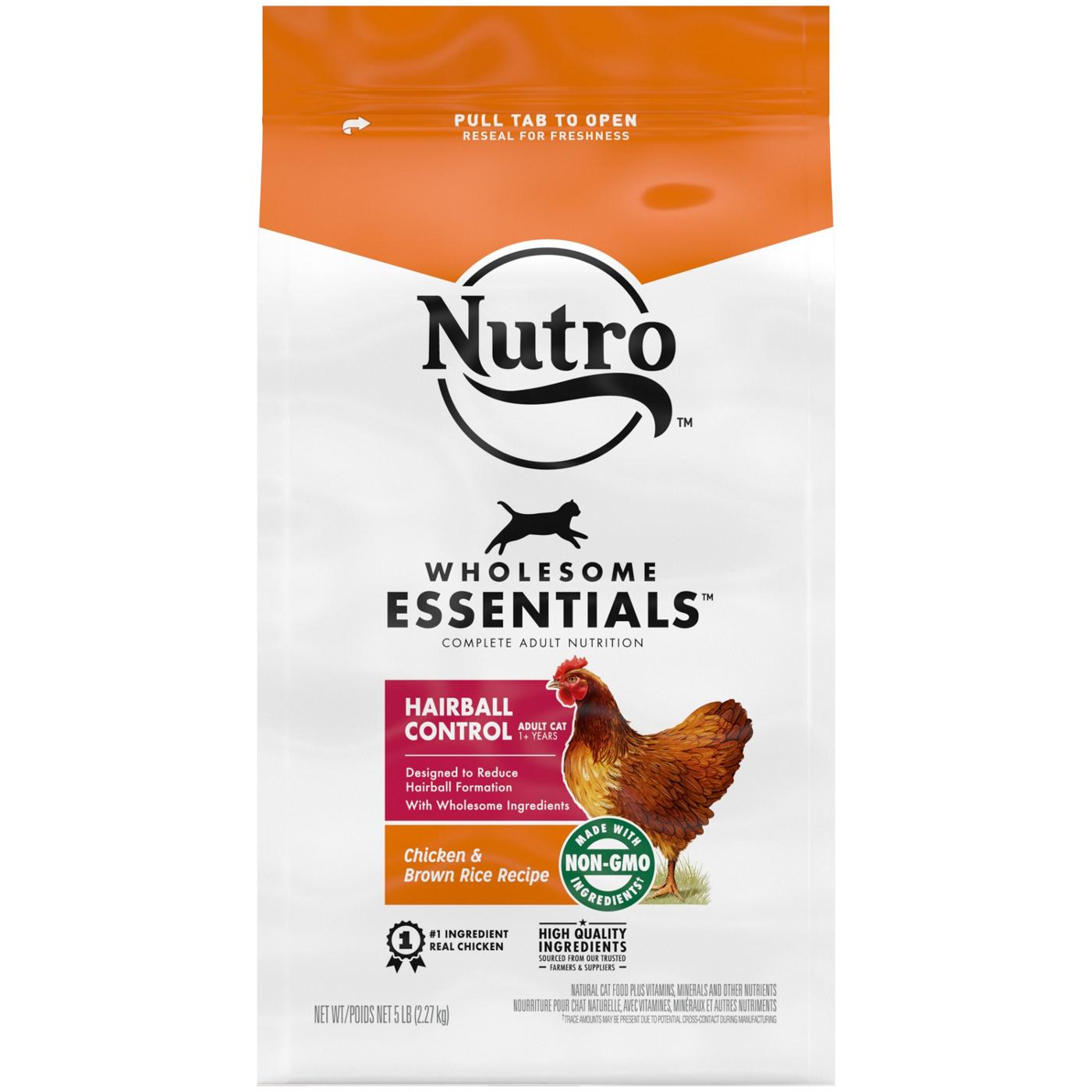We understand that pet owners want the best for their cats. That’s why Nutro partners with trusted farmers and suppliers to source high-quality ingredients and craft nutritious recipes that both you and your cat will love. Nutro Wholesome Essentials Dry Cat Food Hairball Control Chicken & Brown Rice Recipe is made with real chicken as the #1 ingredient, providing a flavor it knows and loves. This dry cat food recipe is designed to reduce hairball formation with a natural fiber blend. With essential antioxidants like Vitamin E and Selenium, this dry cat food recipe also supports healthy immunity in your cat. Omega-6 Fatty Acids help support a healthy skin & coat, helping your furry friend look good and feel good. Plus, it's made with non-GMO ingredients and has no chicken by-product meal, corn, wheat, or soy. Give your cat a quality recipe with Nutro Wholesome Essentials Dry Cat Food Hairball Control Recipes.Contains: 5 lb. Bag of Nutro Wholesome Essentials Dry Cat Food Hairball Control Chicken & Brown Rice Recipe.Nutritious and Digestible: Nutro Wholesome Essentials Dry Cat Food is made with real, recognizable, natural ingredients plus vitamins, minerals & nutrients.Real Chicken First: Nutro Wholesome Essentials Dry Cat Food Enhanced Care Sensitive is made with real chicken as the #1 ingredient.Easily Digestible: Crafted with natural prebiotic fiber to support healthy digestion, this dry cat food is a thoughtful choice for cats with sensitive stomachs.Essential Antioxidants: This dry cat food supports healthy immunity with essential antioxidants like Vitamin E and Selenium.Supports Healthy Skin and Coat: Nutro Wholesome Essentials Dry Cat Food Enhanced Care Sensitive is rich in Omega-6 Fatty Acids to support a healthy skin and coat.