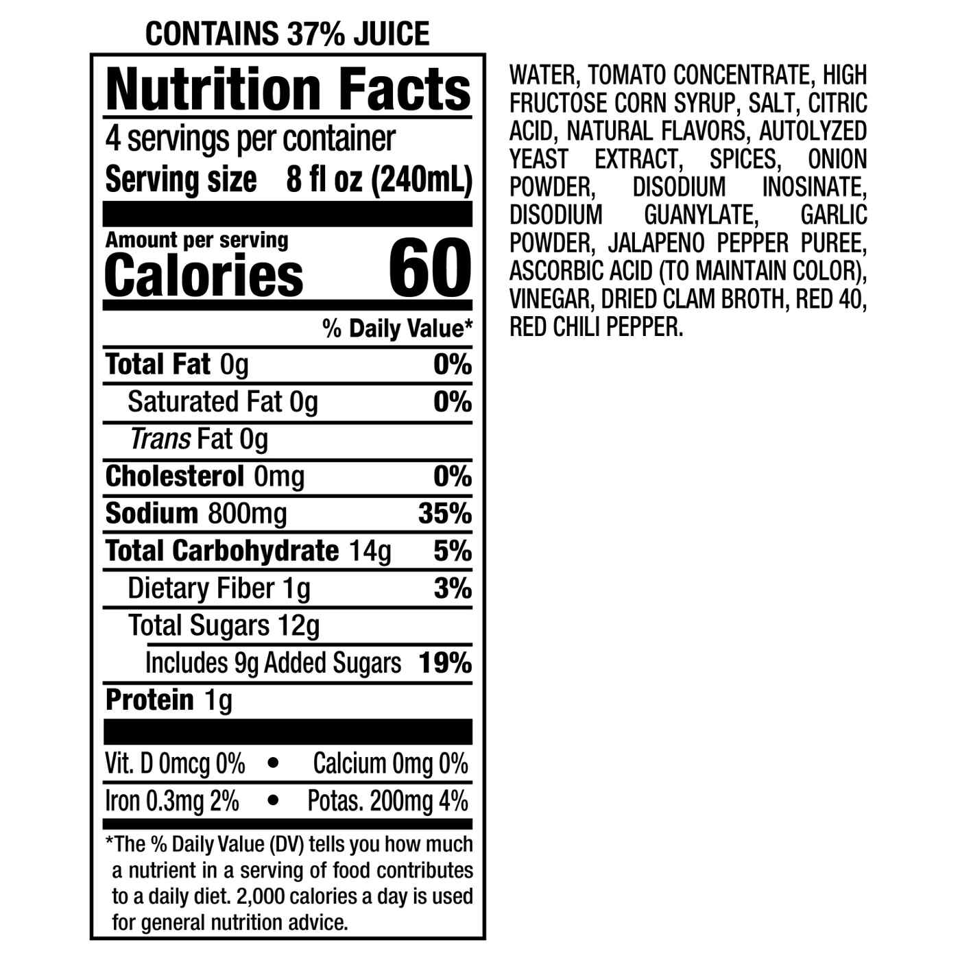 Water, Tomato Concentrate, High Fructose Corn Syrup, Salt, Citric Acid, Natural Flavors, Autolyzed Yeast Extract, Spices, Onion Powder, Disodium Inosinate, Disodium Glutamate, Garlic Powder, Jalapeno Pepper Puree, Ascorbic Acid (to Maintain Color), Vinegar, Dried Clam Broth, Red 40, Red Chili Pepper