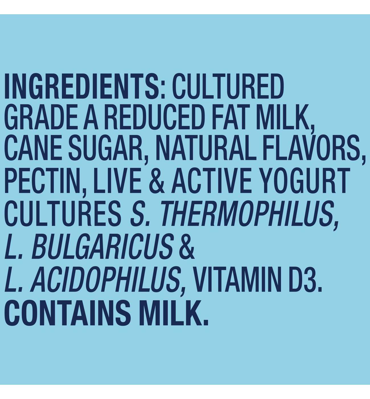 Cultured Grade A Reduced Fat Milk, Cane Sugar, Natural Flavors, Pectin, Live & Active Yogurt Cultures S. Thermophilus, L. Bulgaricus & L. Acidophilus.Allergens and safety warnings