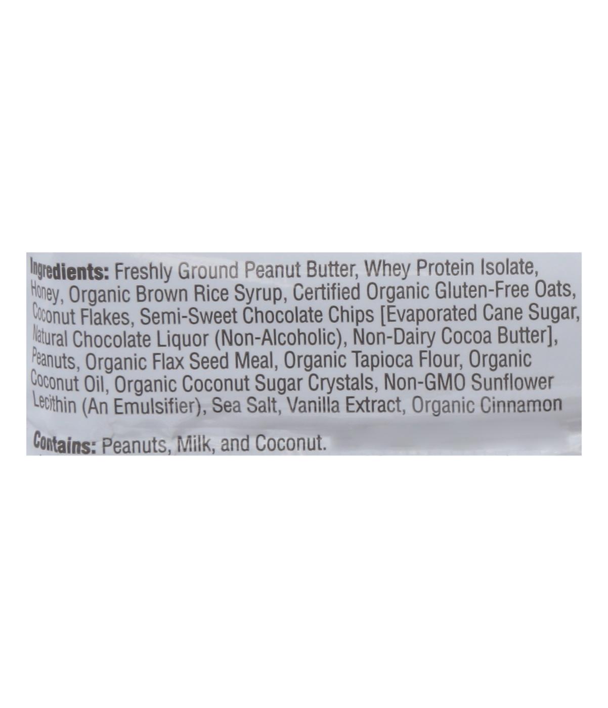 Freshly Ground Peanut Butter, Whey Protein Isolate, Honey, Organic Brown Rice Syrup, Certified Organic Gluten Free Oats, Coconut Flakes, Semi-Sweet Chocolate Chips (Evaporated Cane Sugar, Natural Chocolate Liquor (Non Alcoholic), Non-Dairy Cocoa Butter), Peanuts, Organic Flax Seed Meal, Organic Tapioca Flour, Organic Coconut Oil, Organic Coconut Sugar Crystals, Non-Gmo Sunflower Lecithin (An Emulsifier), Sea Salt, Organic Vanilla Extract, Organic Cinnamon.Allergens and safety warnings
