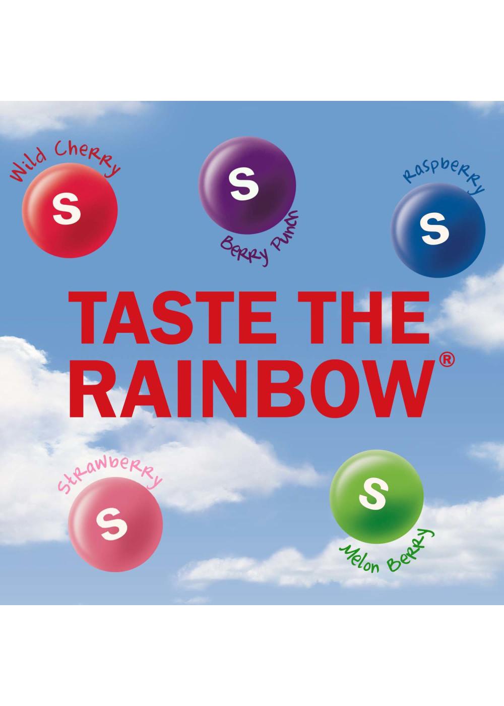 • Taste the Rainbow Wild Berry SKITTLES includes berry punch, strawberry, melon berry, wild cherry, and raspberry flavors.