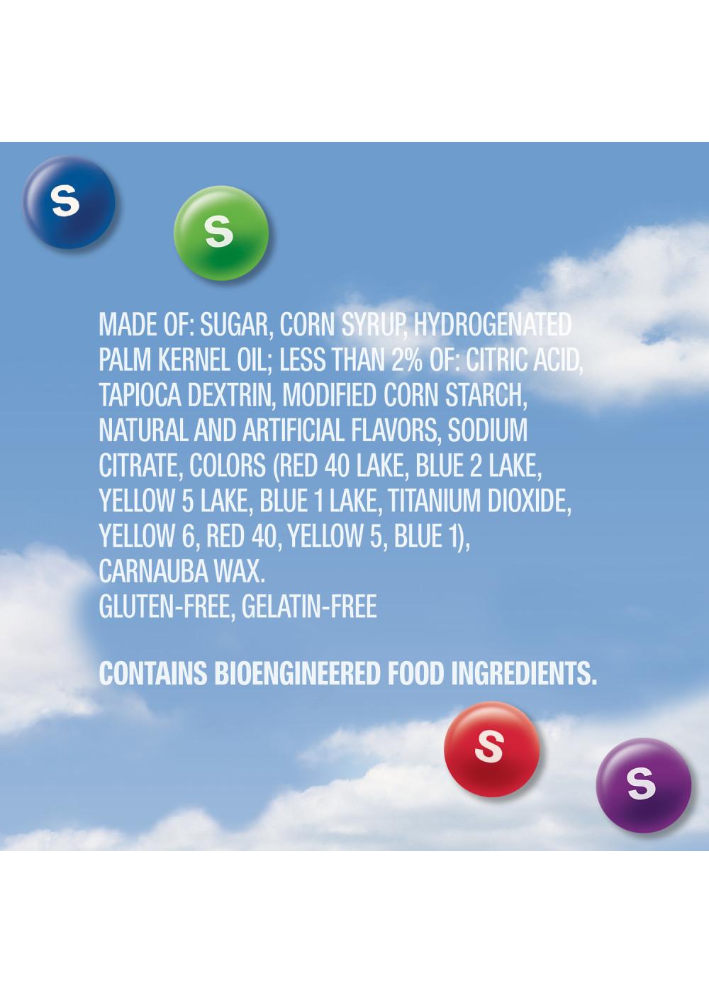 Sugar, Corn Syrup, Hydrogenated Palm Kernel Oil; Less Than 2% Of: Citric Acid, Tapioca Dextrin, Modified Corn Starch, Natural And Artificial Flavors, Sodium Citrate, Colors (Includes Red 40 Lake, Blue 2 Lake, Yellow 5 Lake, Blue 1 Lake, Yellow 6, Red 40, Yellow 5, Blue 1), Carnauba Wax.