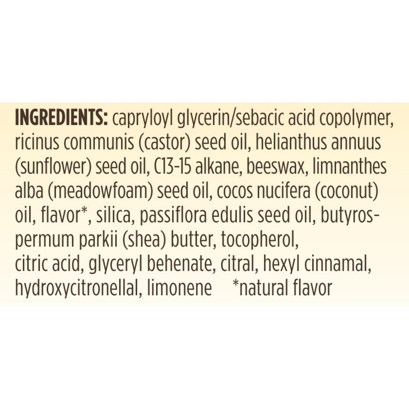 Capryloyl Glycerin/Sebacic Acid Copolymer, Ricinus Communis (Castor) Seed Oil, Helianthus Annuus (Sunflower) Seed Oil, C13-15 Alkane, Beeswax, Limnanthes Alba (Meadowfoam) Seed Oil, Cocos Nucifera (Coconut) Oil, Flavor (Natural Flavor), Silica, Passiflora Edulis Seed Oil, Butyrospermum Parkii (Shea) Butter, Tocopherol, Citric Acid, Glyceryl Behenate, Citral, Hexyl Cinnamal, Hydroxycitronellal, Limonene.