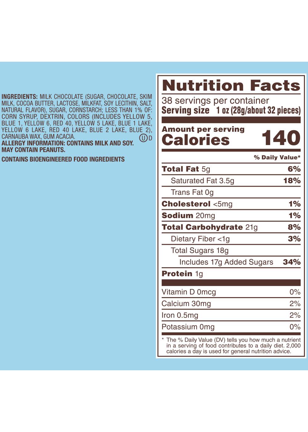 Milk Chocolate (Sugar, Chocolate, Skim Milk, Cocoa Butter, Lactose, Milkfat, Soy Lecithin, Salt, Natural Flavor), Sugar, Cornstarch; Less Than 1% Of: Corn Syrup, Dextrin, Colors (Includes Yellow 5, Blue 1, Yellow 6, Red 40, Yellow 5 Lake, Blue 1 Lake, Yellow 6 Lake, Red 40 Lake, Blue 2 Lake, Blue 2), Carnauba Wax, Gum Acacia.Allergens and safety warnings
