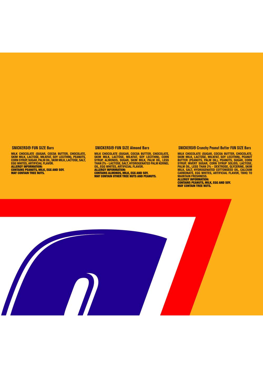 Snickers Crunchy Peanut Butter Fun Size Bars: Milk Chocolate (Sugar, Cocoa Butter, Chocolate, Skim Milk, Lactose, Milkfat, Soy Lecithin), Peanut Butter (Peanuts, Palm Oil), Peanuts, Sugar, Corn Syrup, Invert Sugar, Corn Syrup Solids, Lactose, Palm Oil, Less than 2% - Dextrose, Glycerine, Skim Milk, Salt, Hydrogenated Cottonseed Oil, Calcium Carbonate, Egg Whites, Artificial Flavor, TBHQ to Maintain Freshness. Snickers Fun Size Almond Bars: Milk Chocolate (Sugar, Cocoa Butter, Chocolate, Skim Milk, Lactose, Milkfat, Soy Lecithin), Corn Syrup, Almonds, Sugar, Skim Milk, Palm Oil, Less than 2% - Lactose, Salt, Hydrogenated Palm Kernel Oil, Egg Whites, Artificial Flavor. Snickers Fun Size Bars: Milk Chocolate (Sugar, Cocoa Butter, Chocolate, Skim Milk, Lactose, Milkfat, Soy Lecithin), Peanuts, Corn Syrup, Sugar, Palm Oil, Skim Milk, Lactose, Salt, Egg Whites, Artificial Flavor.Allergens and safety warnings