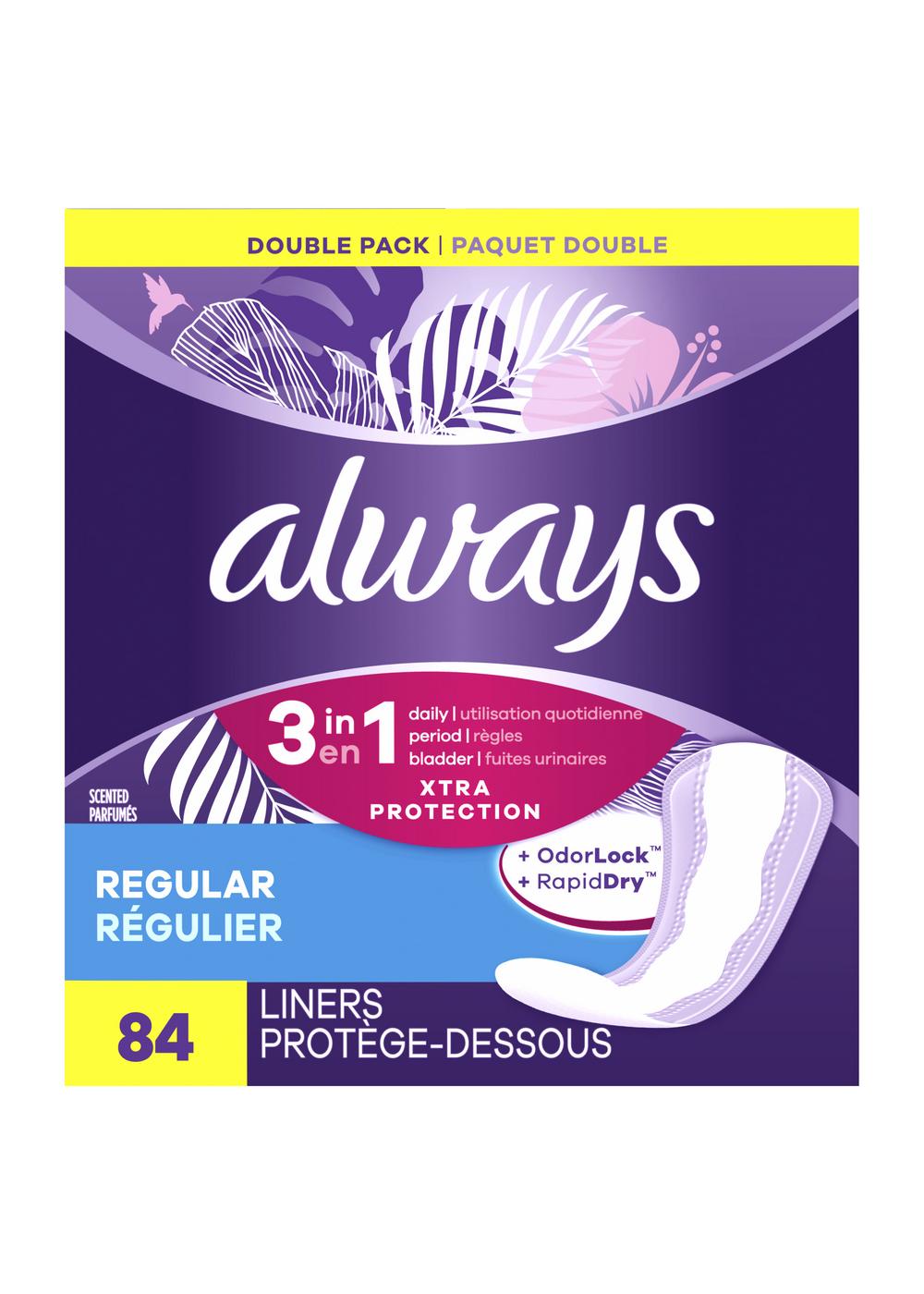 Looking for all-day freshness no matter how you move? Always Xtra Protection 3-in-1 Daily Liners with RapidDry and OdorLock help keep you dry from daily discharge, period leaks, and light incontinence for a fresh and clean feeling. These daily pantiliners absorb leaks in seconds, while the LeakGuards help keep wetness from the sides, so you can feel confident. Always 3-in-1 Daily Liners absorb 8X more to keep you protected from daily discharge, periods, and bladder leaks (vs. Always Thin Daily Liners) and have Edge-2-Edge Adhesive helps keep the panty liner in place. Since Always offers a wide range of liners to meet your needs, remember to use the Always Liners Fit sizing chart so you can find your best fit. Frequently Asked Questions: Why should I wear panty liners? Panty liners protect your underwear and help you stay fresh and clean, no matter if it’s against irregular periods or everyday vaginal discharge. How do I find the right panty liner? Always panty liners come in different lengths and absorbencies. Check the comparison chart above to find the one that fits you best. I am concerned about odor. What is the best liner for my needs? Always 3-in-1 Xtra Protection pantiliners contain odor-neutralizing technology, so you don't need to worry about odors.