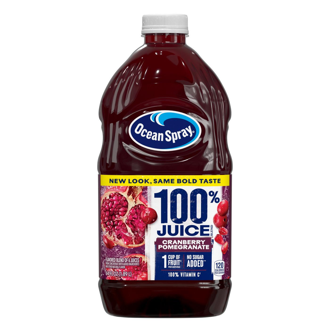 Cult, meet classic with Ocean Spray 100% Juice Cranberry Pomegranate Juice Blend. AKA the good-for-you renegade that tracks all the way back to the bog. Crisp. Clean. 100% Juice blend for a radically refreshing fruit juice. With a 100% recommended daily value of vitamin C, no added sugar and a full cup of fruit per 8 fl oz serving, this cranberry pomegranate juice blend has it all.