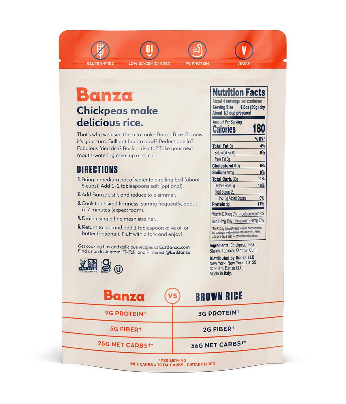 Rice made from chickpeas. Powered by chickpeas. Chickpeas make delicious rice. That's why we used them to make Banza Rice. So now it's your turn. Brilliant burrito bowl? Perfect paella? Fabulous fried rice? Rockin' risotto? Take your next mouth-watering meal up to a notch!