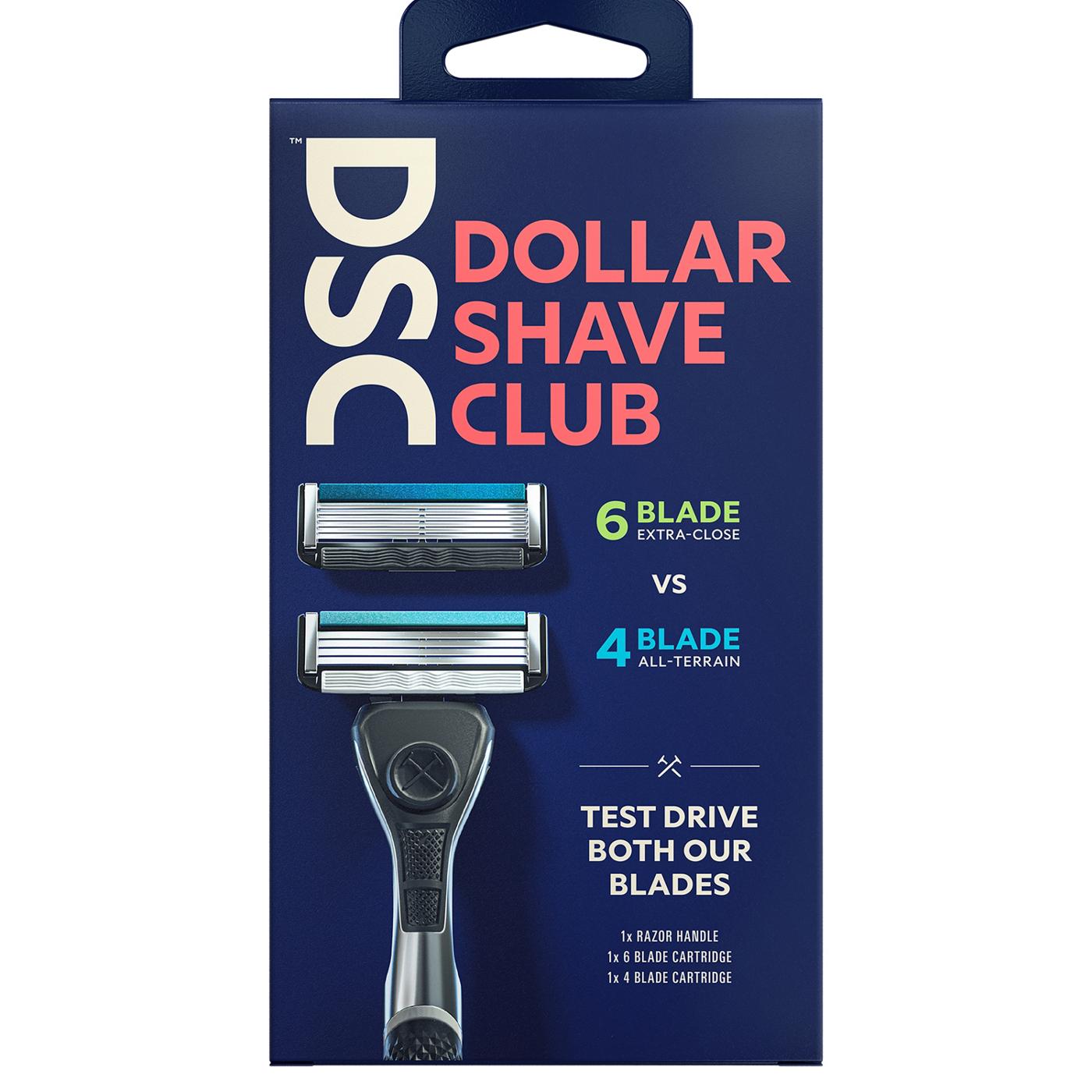 • Test both our blades with the Dollar Shave Club Mixed Starter Set, which comes with a 6-Blade cartridge, a 4-Blade cartridge and a sturdy razor handle for a clean and precise shave