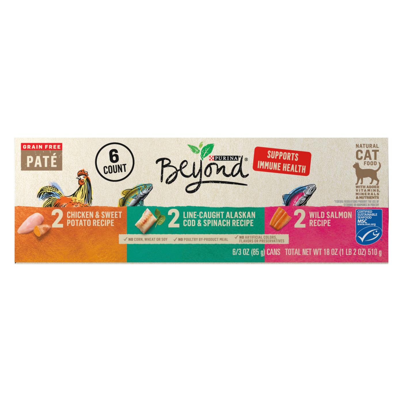 Give your feline friend a variety of natural cat food selections with added vitamins, minerals, and nutrients with this Purina Beyond Grain Free Cat Food Pate canned cat food variety pack. This pate cat food variety pack includes three recipes featuring real chicken cod or salmon as the number 1 ingredient. Accents of wholesome vegetables round out each Purina Beyond Cat Food recipe, giving your cat real, recognizable ingredients you know and trust. Formulated without artificial colors, flavors or preservatives, this natural cat food variety pack gives your cat the nourishment she needs and nothing she doesn't. Rest easy knowing she's getting a wholesome meal formulated to support her long-term health and well-being. We believe that when we connect with what's natural, we connect with what's good in food; that's why this recipe is made with natural ingredients plus essential nutrients for a complete and balanced meal option formulated for adult cats. For the variety your feline fancies, trust Purina Beyond grain free cat food.