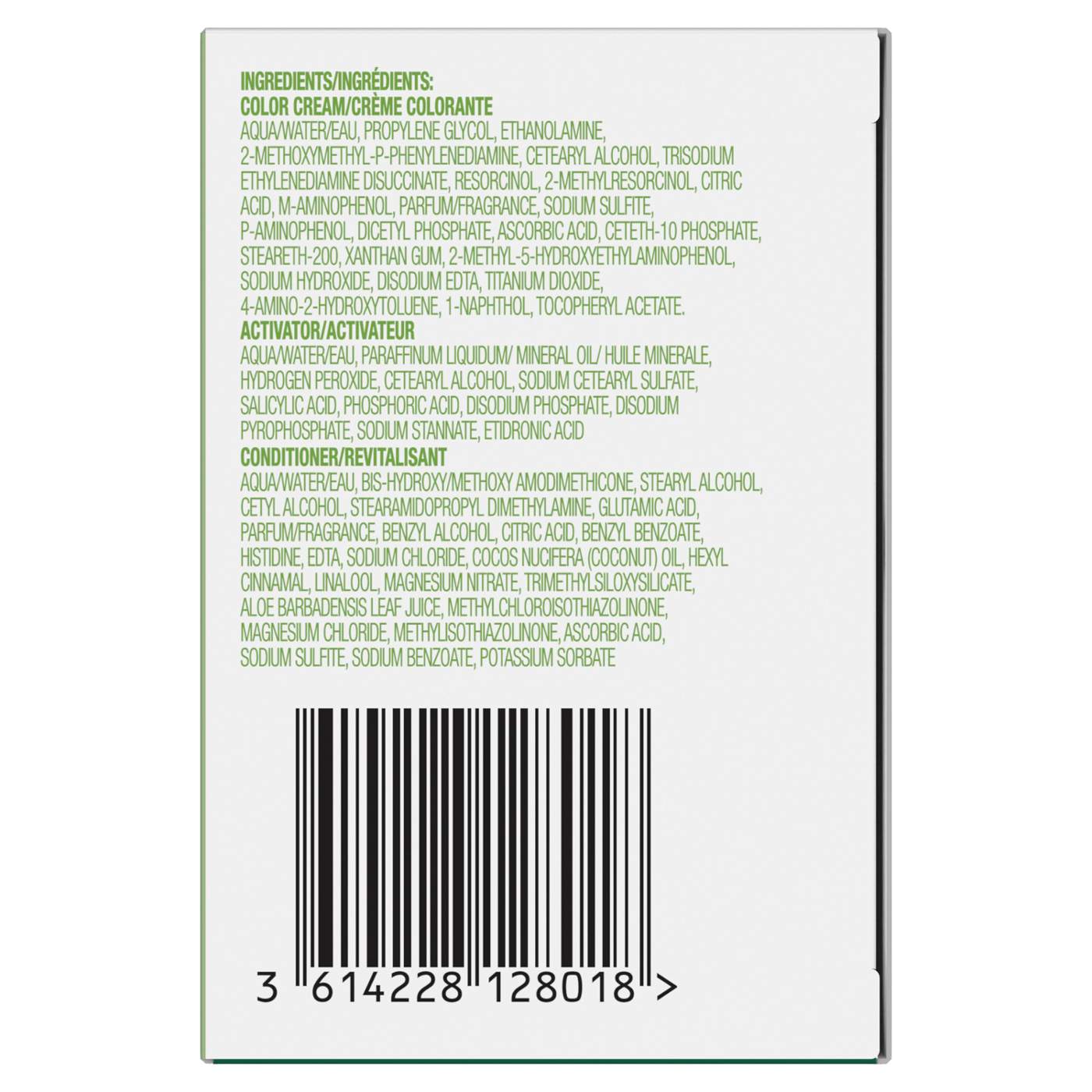 Color Cream Aqua/Water/Eau, Propylene Glycol, Ethanolamine, 2-Methoxymethyl-P-Phenylenediamine, Cetearyl Alcohol, Trisodium Ethylenediamine Disuccinate, Resorcinol, 2-Methylresorcinol, Citric Acid, Parfum/Fragrance, Sodium Sulfite, Dicetyl Phosphate, Ascorbic Acid, Ceteth-10 Phosphate, Steareth-200, Xanthan Gum, M-Aminophenol, Sodium Hydroxide, Titanium Dioxide/(CI 77891), Disodium EDTA, 4-Amino-2-Hydroxytoluene, Tocopheryl Acetate, Hydroxyethyl-3.4-Methylenedioxyaniline HCl, Color Activator Aqua/Water/Eau, Paraffinum Liquidum/Mineral Oil/Huile Minerale, Hydrogen Peroxide, Cetearyl Alcohol, Sodium Cetearyl Sulfate, Salicylic Acid, Phosphoric Acid, Disodium Phosphate, Disodium Pyrophosphate, Sodium Stannate, Etidronic Acid, Brilliant Shine Conditioner Aqua/Water/Eau, Bis-Hydroxy/Methoxy Amodimethicone, Stearyl Alcohol, Cetyl Alcohol, Stearamidopropyl Dimethylamine, Glutamic Acid, Parfum/Fragrance, Benzyl Alcohol, Citric Acid, Benzyl Benzoate, EDTA, Histidine, Cocos Nucifera (Coconut) Oil, Sodium Chloride, Hexyl Cinnamal, Linalool, Magnesium Nitrate, Trimethylsiloxysilicate, Aloe Barbadensis Leaf Juice, Methylchloroisothiazolinone, Magnesium Chloride, Methylisothiazolinone, BHT, Ascorbic Acid, Potassium Sorbate, Sodium Benzoate, Sodium Sulfite.Allergens and safety warnings