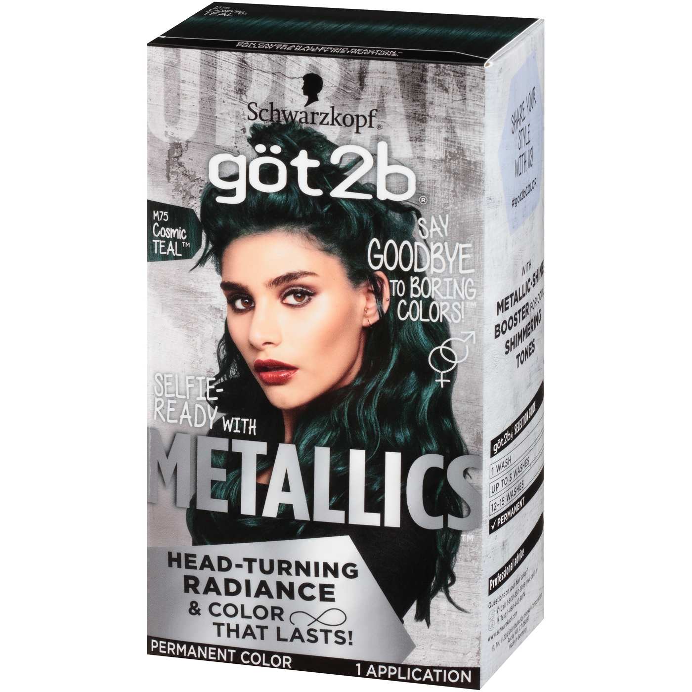 Make a bold statement with this permanent hair color in a vibrant cosmic teal. The göt2b Metallics formula provides a unique, shimmering metallic finish for an eye-catching look. This long-lasting color is perfect for expressing your individual style.• Delivers a multi-dimensional, shimmering metallic finish.• Formulated for long-lasting, fade-resistant color.• Creates a vibrant, head-turning cosmic teal shade.