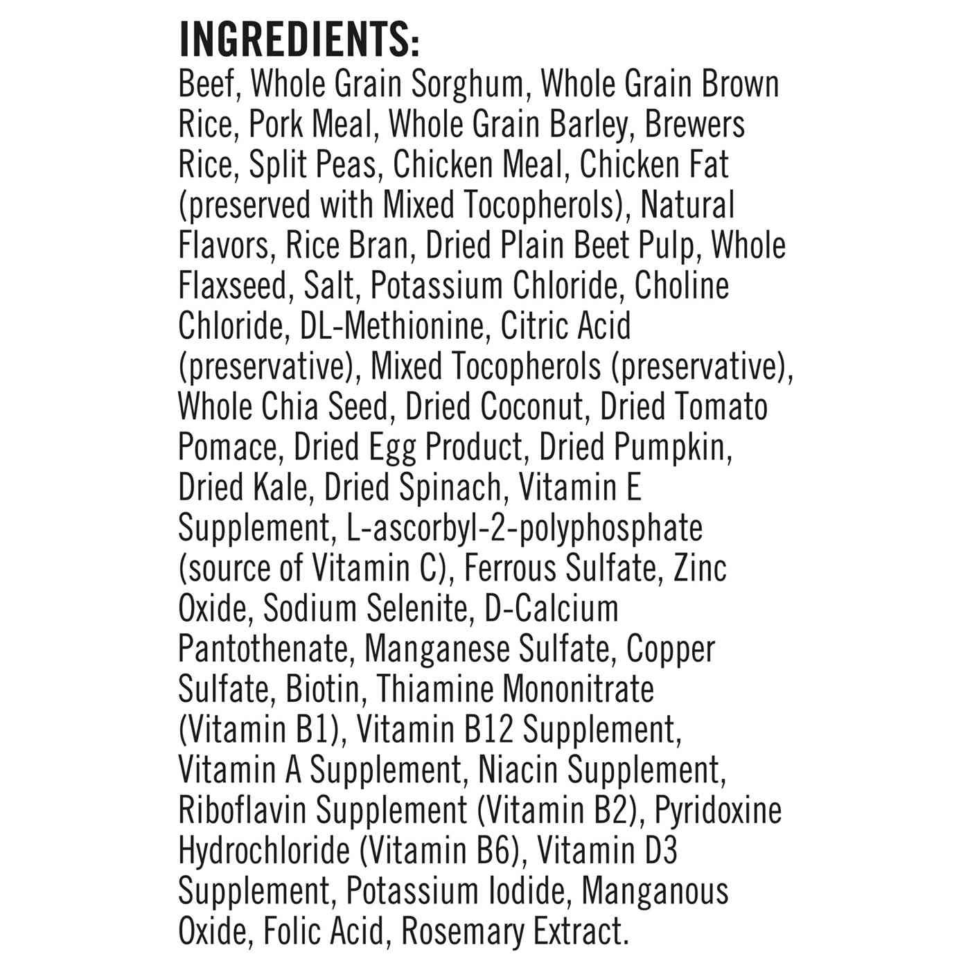 Beef, Whole Grain Brown Rice, Whole Grain Sorghum, Pork Meal, Whole Grain Barley, Brewers Rice, Split Peas, Chicken Fat (preserved with Mixed Tocopherols), Chicken Meal, Natural Flavor, Rice Bran, Dried Plain Beet Pulp, Whole Flaxseed, Salt, Potassium Chloride, Choline Chloride, DL-Methionine, Citric Acid (preservative), Mixed Tocopherols (preservative), Chia Seed, Dried Coconut, Dried Tomato Pomace, Dried Egg Product, Dried Pumpkin, Dried Kale, Dried Spinach, Vitamin E Supplement, Ferrous Sulfate, Zinc Oxide, Sodium Selenite, Ascorbic Acid (Vitamin C), Manganese Sulfate, Copper Sulfate, D-Calcium Pantothenate, Biotin, Thiamine Mononitrate (Vitamin B1), Vitamin B12 Supplement, Vitamin A Supplement, Niacin Supplement, Riboflavin Supplement (Vitamin B2), Pyridoxine Hydrochloride (Vitamin B6), Vitamin D3 Supplement, Manganous Oxide, Potassium Iodide, Folic Acid, Rosemary ExtractAllergens and safety warnings