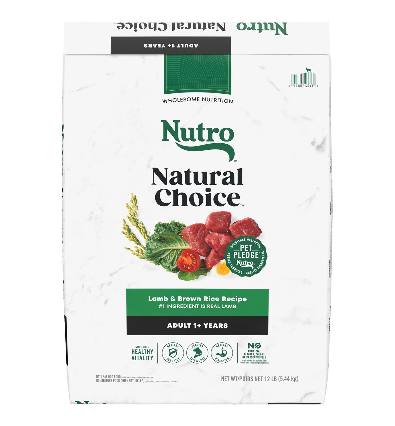 We understand that pet owners want the best for their dogs. That’s why Nutro has a partnership with trusted farmers and suppliers to source high-quality ingredients, giving your dog quality nutrition both you and your pet will appreciate. Made with lamb as the #1 ingredient, and crafted with vitamins, minerals, and other nutrients, Nutro Natural Choice Adult Dry Dog Food, Lamb & Brown Rice Recipe brings real, recognizable ingredients to every mealtime. Crafted with Omega 3 & 6 Fatty Acids, this dry dog food promotes healthy skin and a soft, shiny coat. Plus, it's made with non-GMO ingredients and has no chicken by-product meal, corn, wheat, or soy. With ingredients that promote healthy skin and coat, digestion, and immunity, this dry dog food recipe also supports your dog’s vitality. Packed with delicious flavor, high quality ingredients, and supportive benefits, serve your furry loved one something they will love with Nutro Natural Choice Dry Dog Food Recipes.Made With Real Lamb: This dry dog food recipe is made with real lamb as the #1 ingredient in this protein-rich recipe.Quality Recipe: This dry dog food recipe is made with non-GMO ingredients; no chicken by-product meal, corn, wheat, or soy.Supports Vitality: Nutro Natural Choice Adult Dry Dog Food promotes healthy vitality by supporting healthy skin & coat, healthy digestion, and immunity for your dog.Key Benefits: This dry dog food recipe supports healthy energy, strong bones, and strong muscles.Contains One (1) 12 lb. Bag of Nutro Natural Choice Adult Dry Dog Food, Lamb & Brown Rice Recipe.Fine Ingredients: This dry dog food recipe is crafted in our USA facilities with the finest ingredients from around the world.