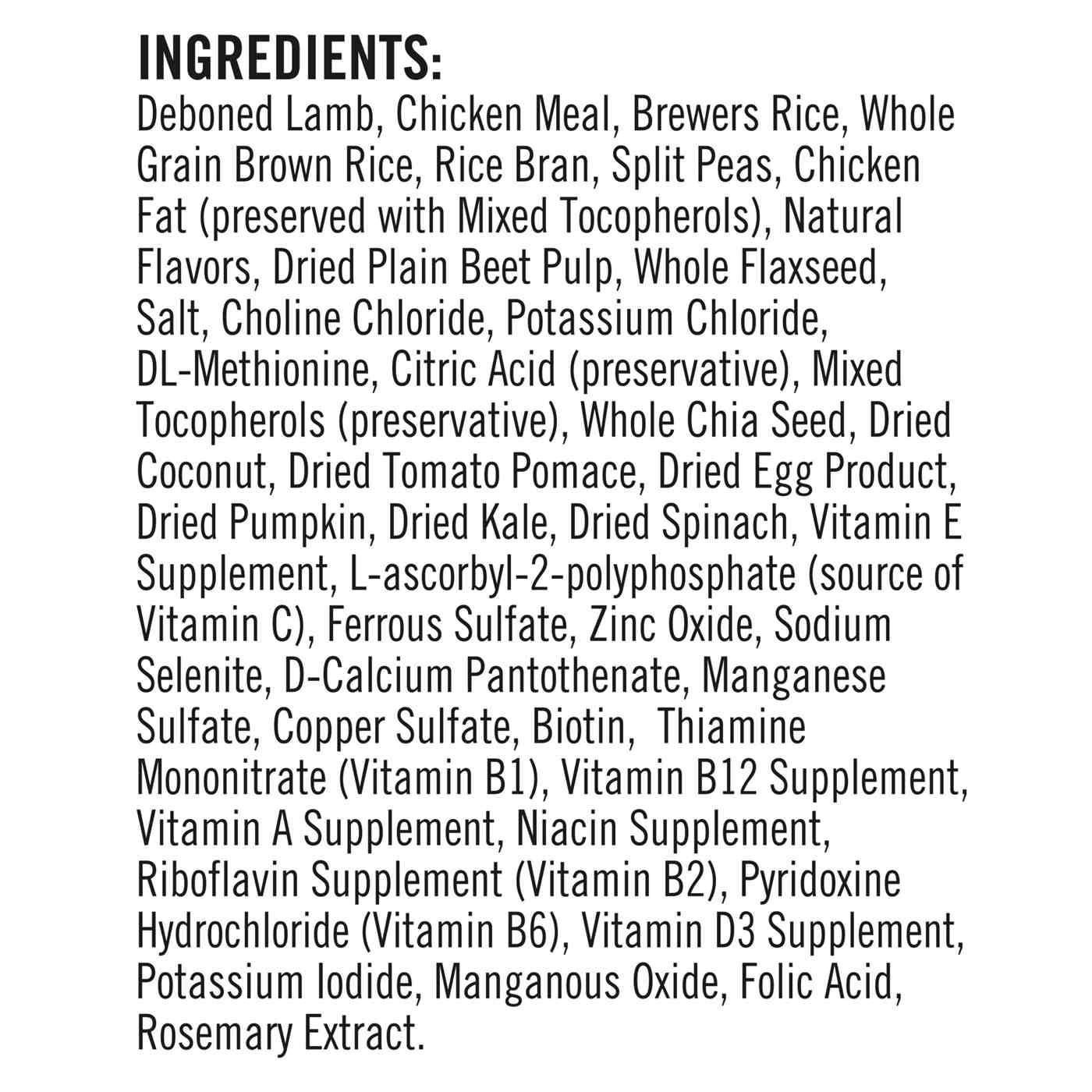 Deboned Lamb, Chicken Meal, Brewers Rice, Whole Grain Brown Rice, Rice Bran, Split Peas, Chicken Fat (preserved with Mixed Tocopherols), Natural Flavors, Dried Plain Beet Pulp, Whole Flaxseed, Salt, Choline Chloride, Potassium Chloride, DL-Methionine, Citric Acid (preservative), Mixed Tocopherols (preservative), Whole Chia Seed, Dried Coconut, Dried Tomato Pomace, Dried Egg Product, Dried Pumpkin, Dried Kale, Dried Spinach, Vitamin E Supplement, L-ascorbyl-2-polyphosphate (source of Vitamin C), Ferrous Sulfate, Zinc Oxide, Sodium Selenite, D-Calcium Pantothenate, Manganese Sulfate, Copper Sulfate, Biotin, Thiamine Mononitrate (Vitamin B1), Vitamin B12 Supplement, Vitamin A Supplement, Niacin Supplement, Riboflavin Supplement (Vitamin B2), Pyridoxine Hydrochloride (Vitamin B6), Vitamin D3 Supplement, Potassium Iodide, Manganous Oxide, Folic Acid, Rosemary Extract.Allergens and safety warnings