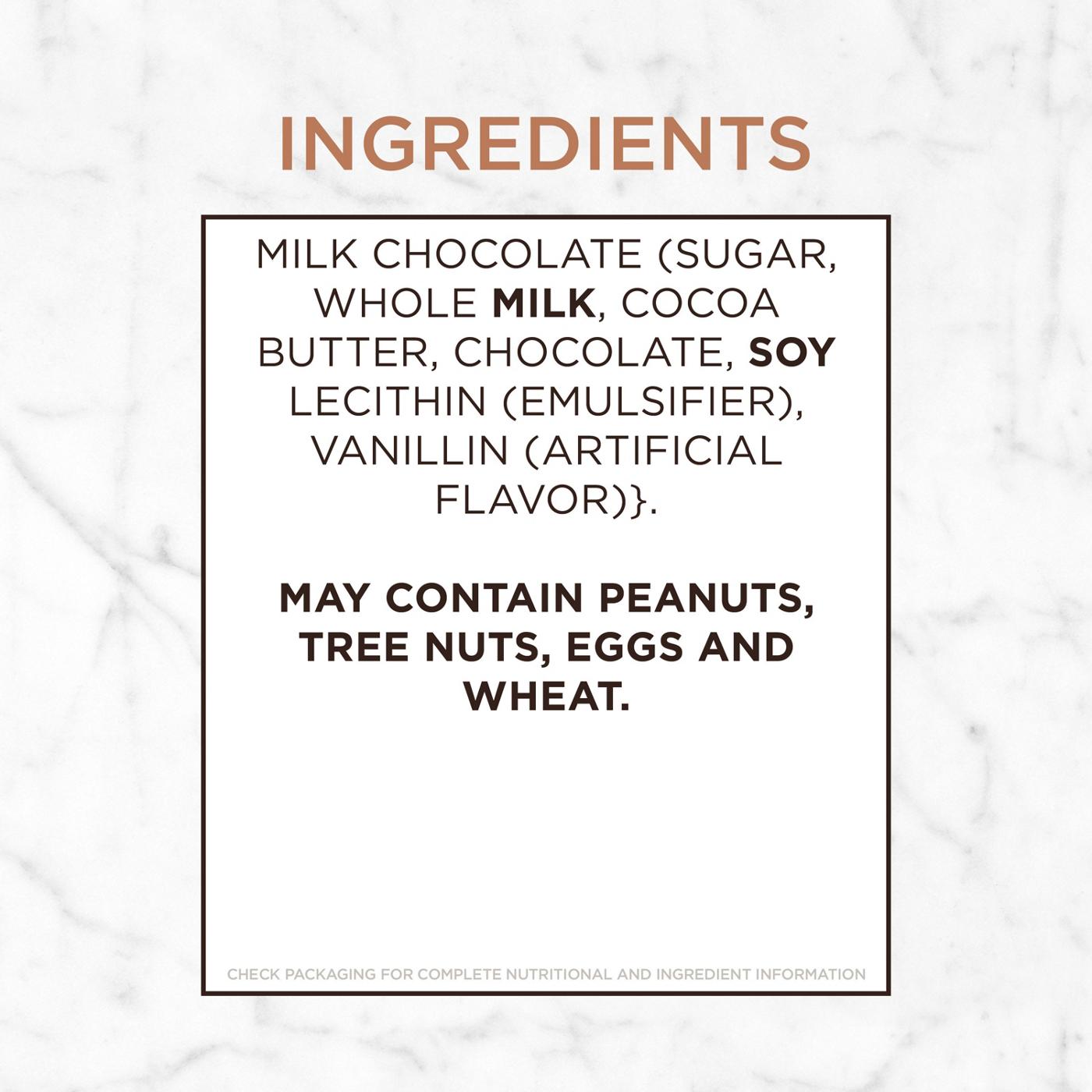 MILK CHOCOLATE {SUGAR, WHOLE MILK, COCOA BUTTER, CHOCOLATE, SOY LECITHIN (EMULSIFIER), VANILLIN (ARTIFICIAL FLAVOR)}.Allergens and safety warnings