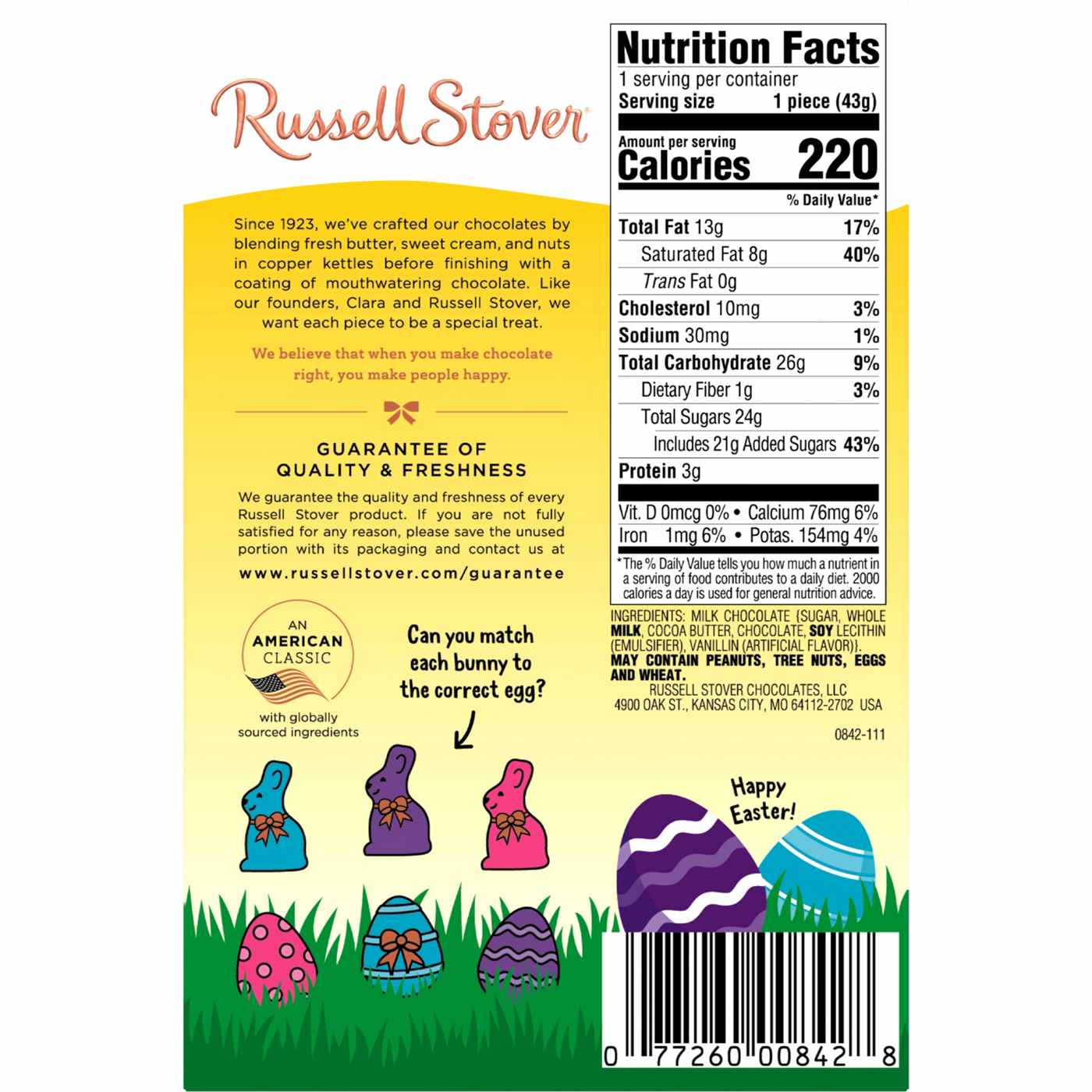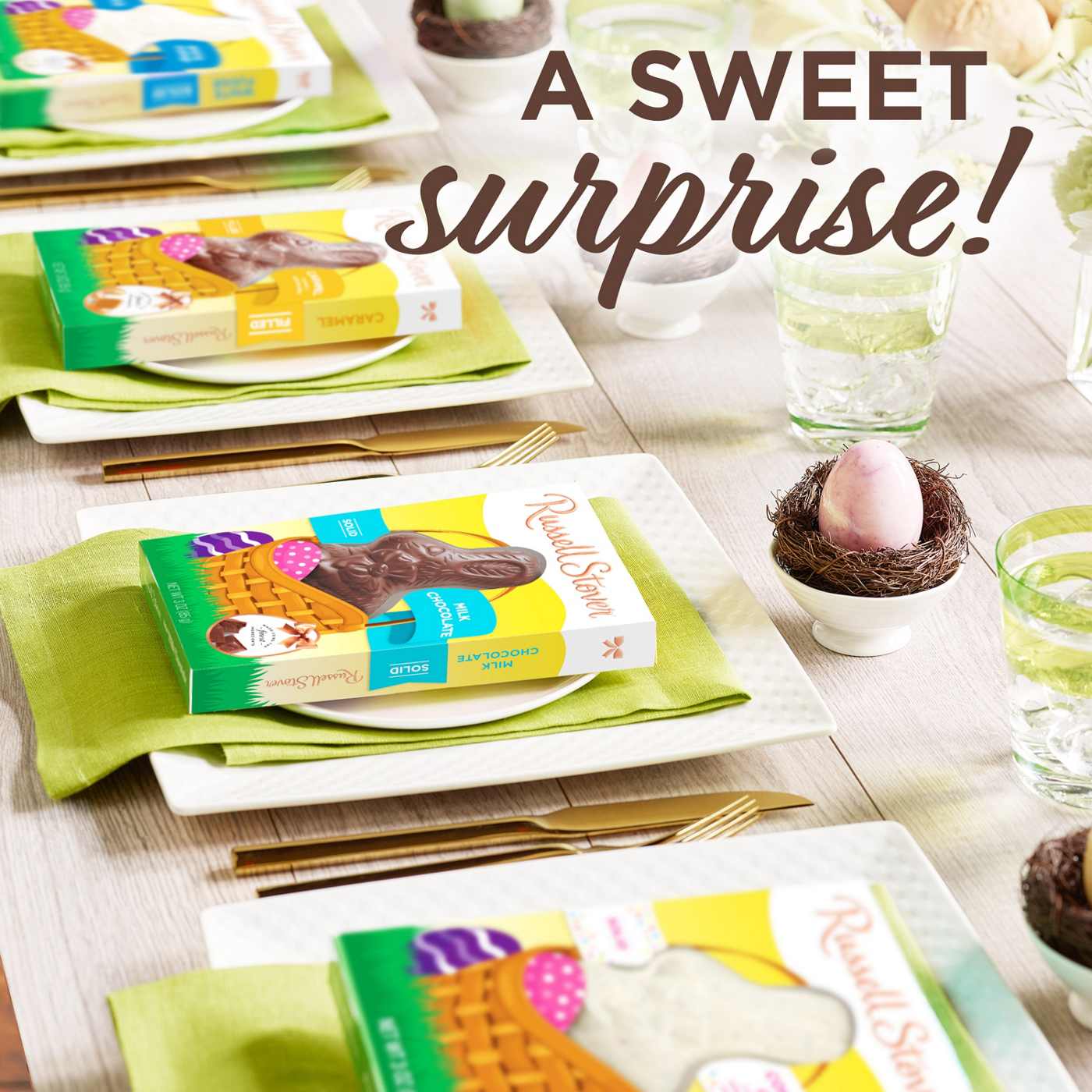 • Solid Milk Chocolate Bunny Delight – This 1.5 oz. RUSSELL STOVER Easter bunny is made from our signature smooth and creamy milk chocolate. A classic treat that brings joy to Easter baskets and springtime celebrations.