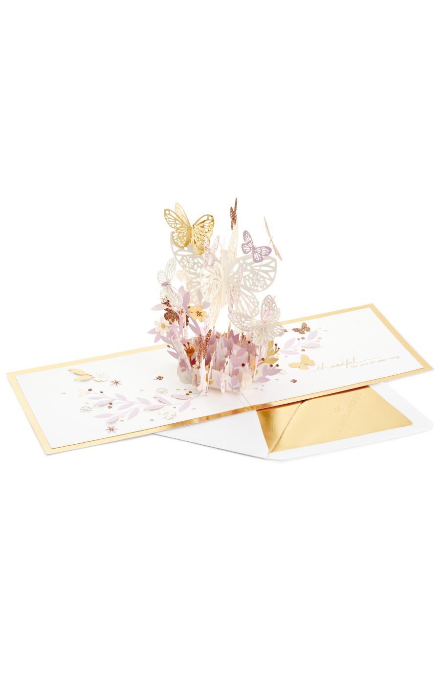 - Cover features gold foil accents and lettering that reads, "Thinking of you today." Inside features an elaborate surprise pop-up of butterflies and flowers, accented with beautiful glitter, and the message: "Thankful for you all year long."
