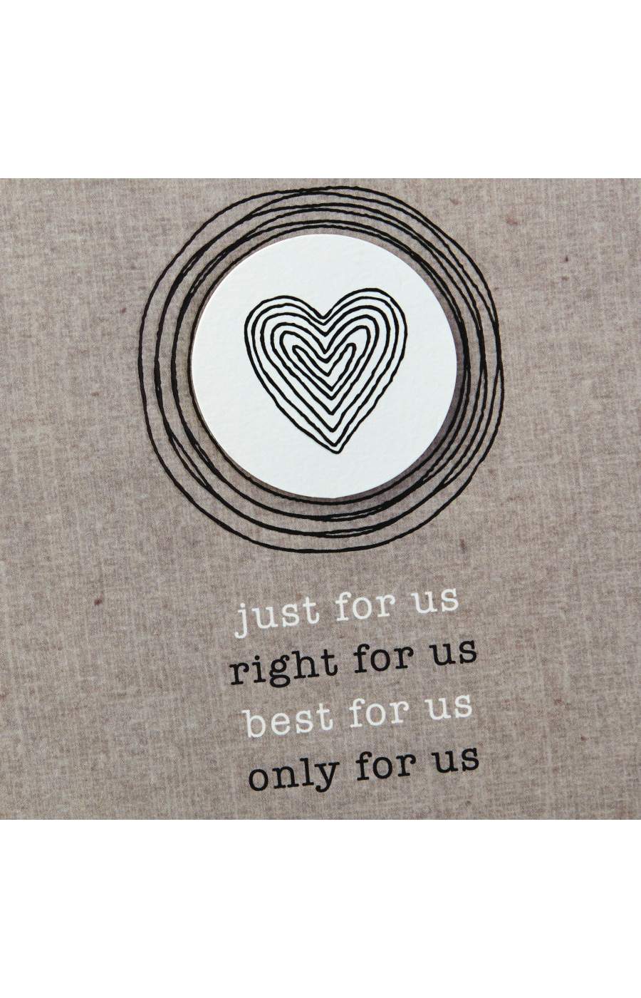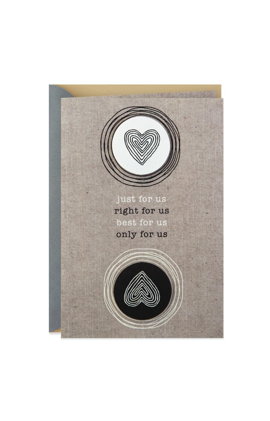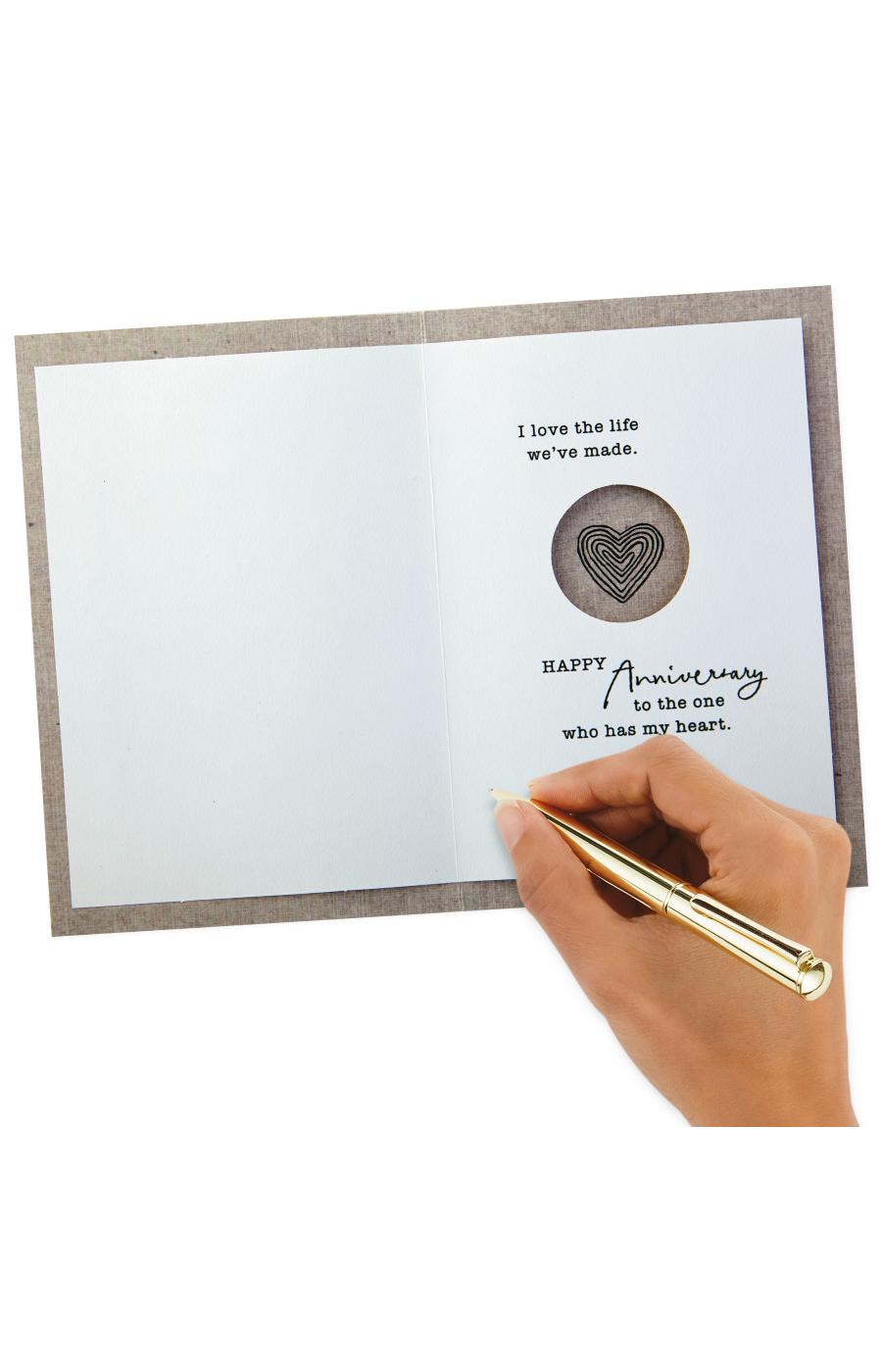 - Cover features complementary black and white line-drawn hearts on a gray background. Inside reads: "I love the life we've made. Happy Anniversary to the one who has my heart."