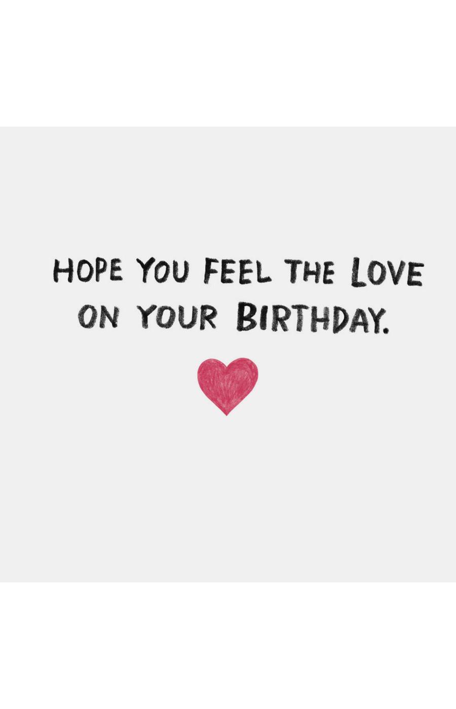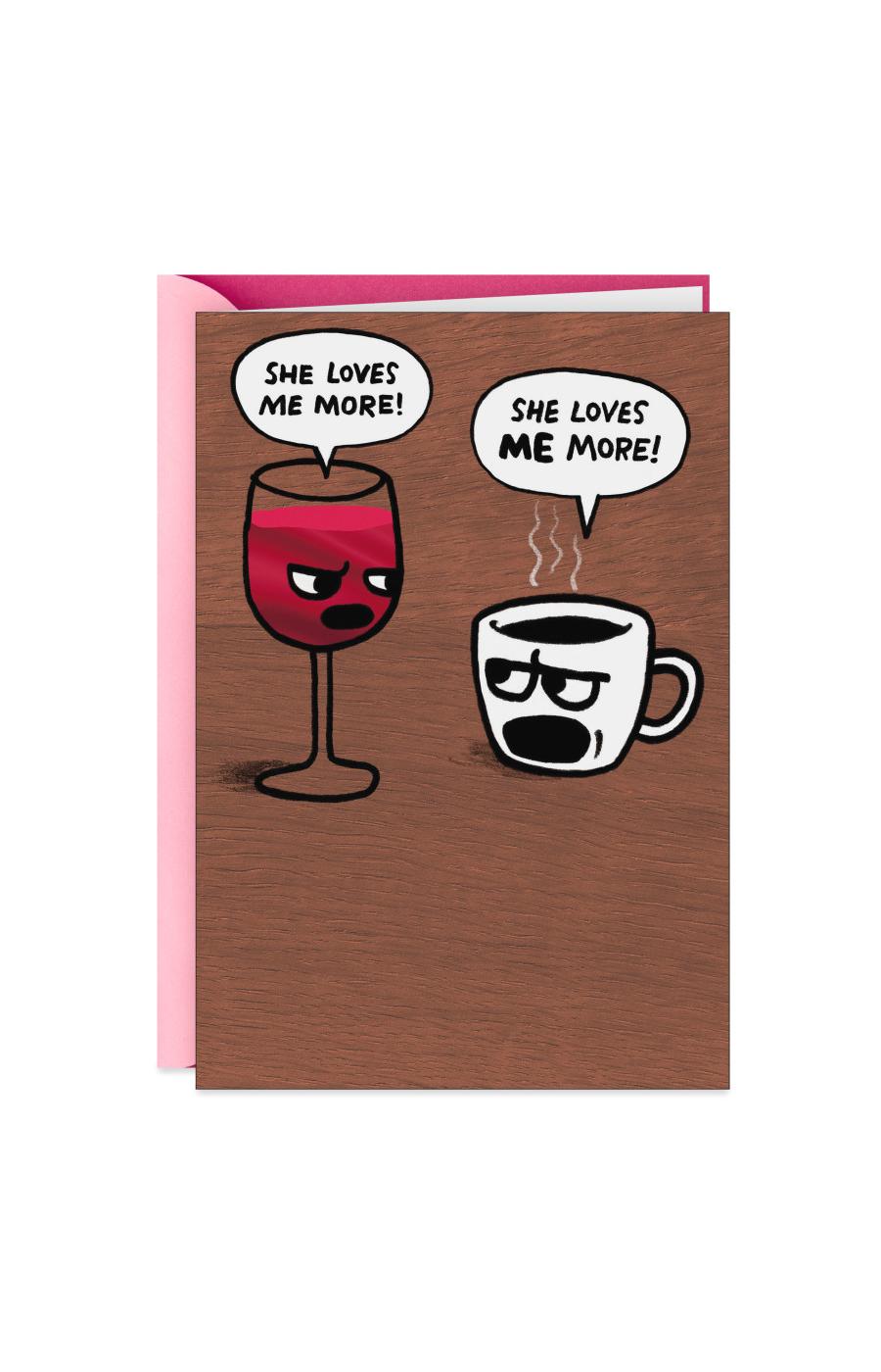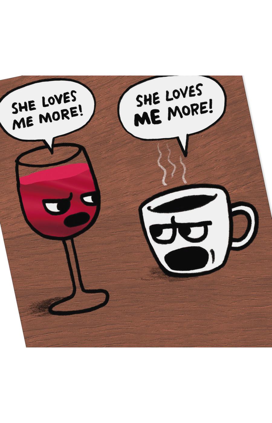 - Front features an illustration of a glass of wine and a mug of coffee on a coffee table arguing about who she loves more. Inside reads: "Hope you feel the love on your birthday."