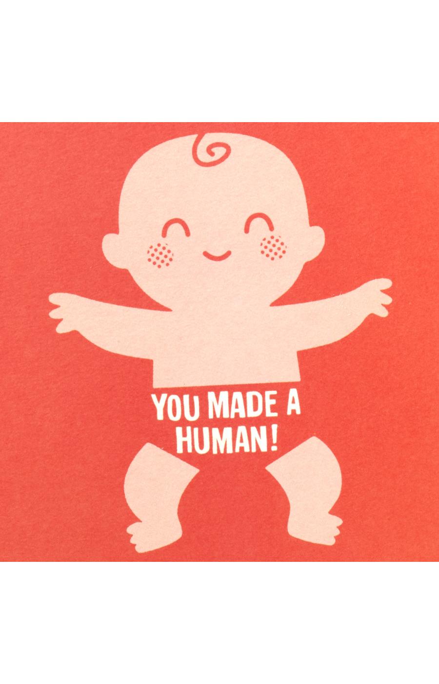 - Cover features an illustrations of a happy baby on a red background with the message: "You made a human!" Inside reads: "Congratulations!"