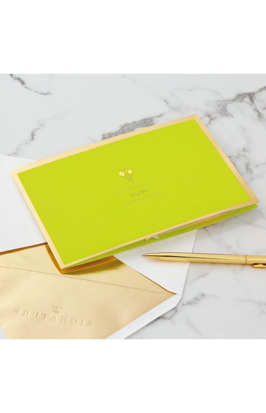 - Yellow cover features gold foil accents and lettering that reads, "Yay!" Inside features an elaborate surprise pop-up of balloons, confetti, and streamers, and the message: "Celebrating you big-time."