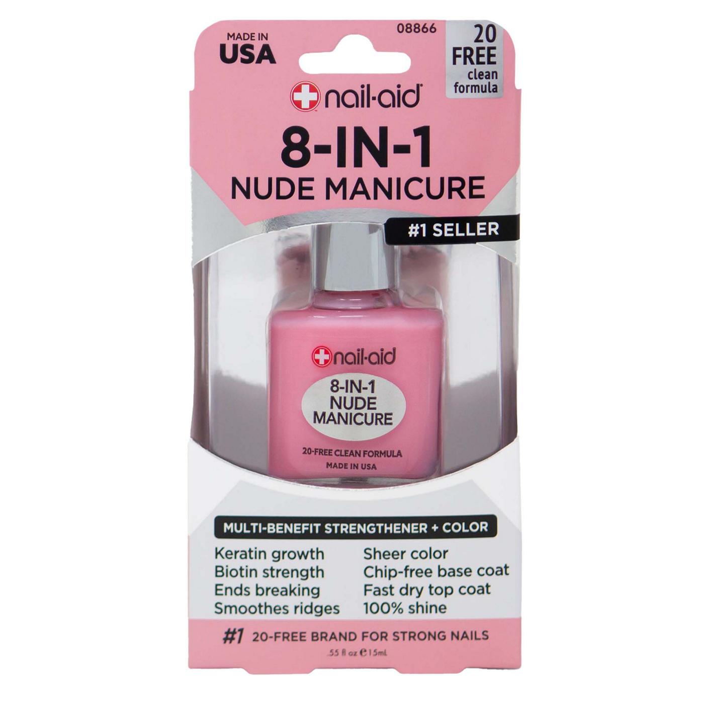 The Nail Aid 8-in-1 Nude Manicure is a multi-purpose nail treatment that provides a clean, sheer pink finish. This versatile formula acts as a strengthener to help protect nails from chipping and breaking. It serves as an all-in-one product for achieving a polished, natural-looking manicure at home.• Multi-benefit formula addresses eight common nail concerns• Provides a sheer, natural-looking tint for a polished look• Acts as a base coat and strengthener to prevent chipping• Helps to fortify nails for improved strength and resilience