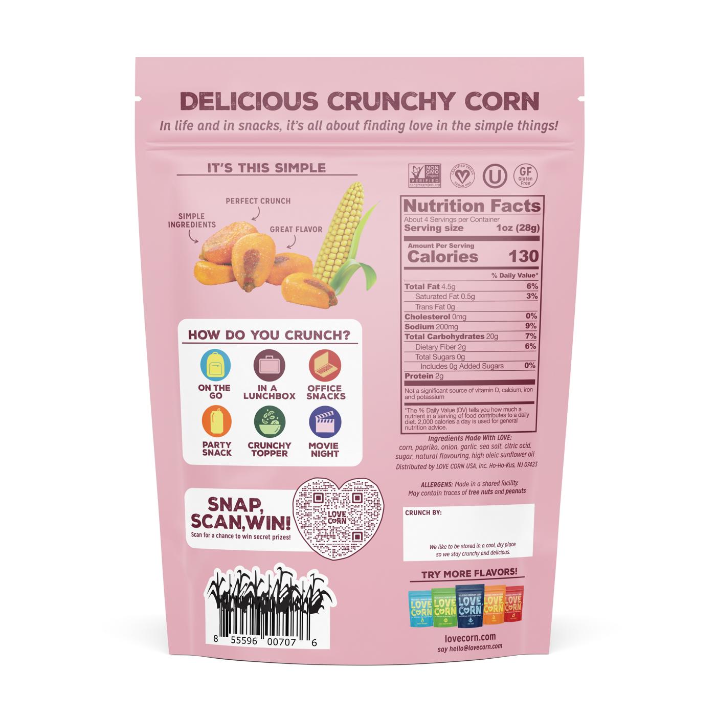 In life and in snacks, it’s all about finding love in the simple things! LOVE CORN’s Delicious Crunchy Corn snacks are made with simple ingredients, bold flavors, and a perfect crunch. A fan favorite amongst busy adults, always-hungry teens and picky little eaters that makes lunchtimes more exciting, road trips go quicker, the party more fun and life a little bit better, one kernel at a time.