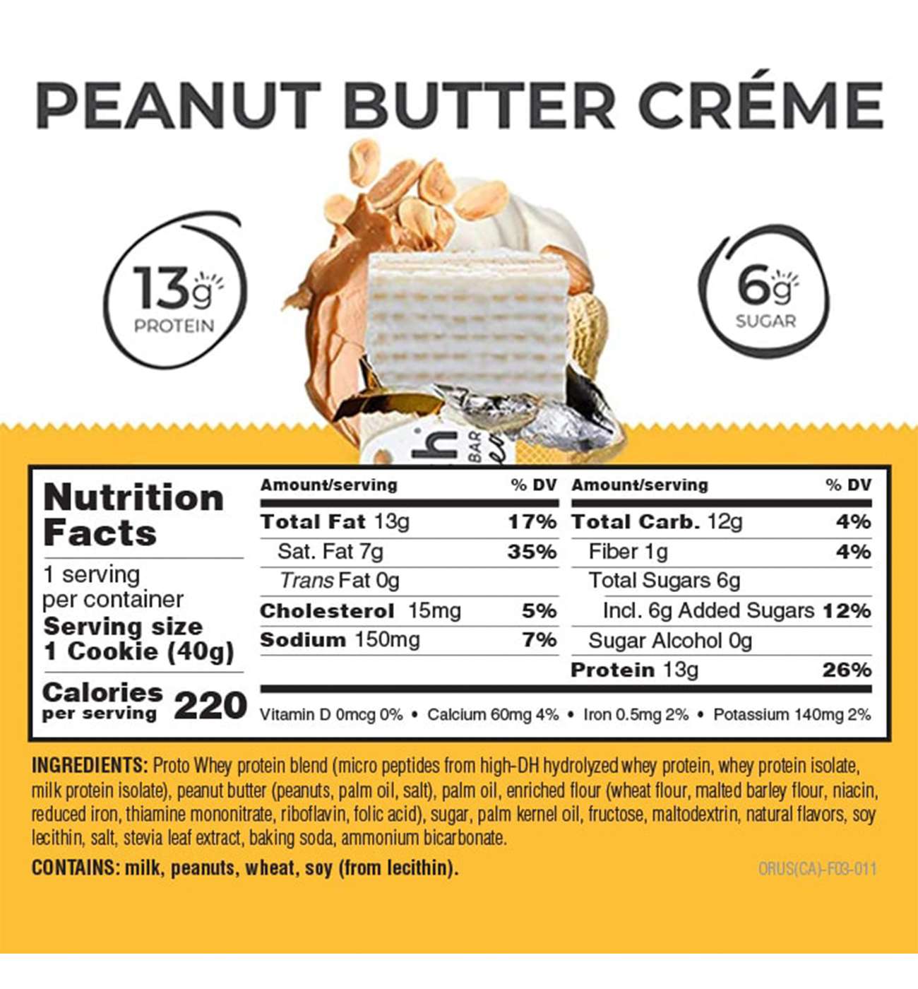 Proto Whey Protein Blend (Micro Peptides from High-DH Hydrolyzed Whey Protein [40% Di and Tripeptides], Whey Protein Isolate, Milk Protein Isolate), Peanut Butter (Peanuts, Palm Oil, Salt), Palm Oil, Enriched Flour (Wheat Flour, Malted Barley Flour, Niacin, Reduced Iron, Thiamine Mononitrate, Riboflavin, Folic Acid), Sugar, Palm Kernel Oil, Fructose, Maltodextrin, Natural Flavors, Soy Lecithin, Salt, Stevia Leaf Extract, Baking Soda, Ammonium Bicarbonate.Allergens and safety warnings