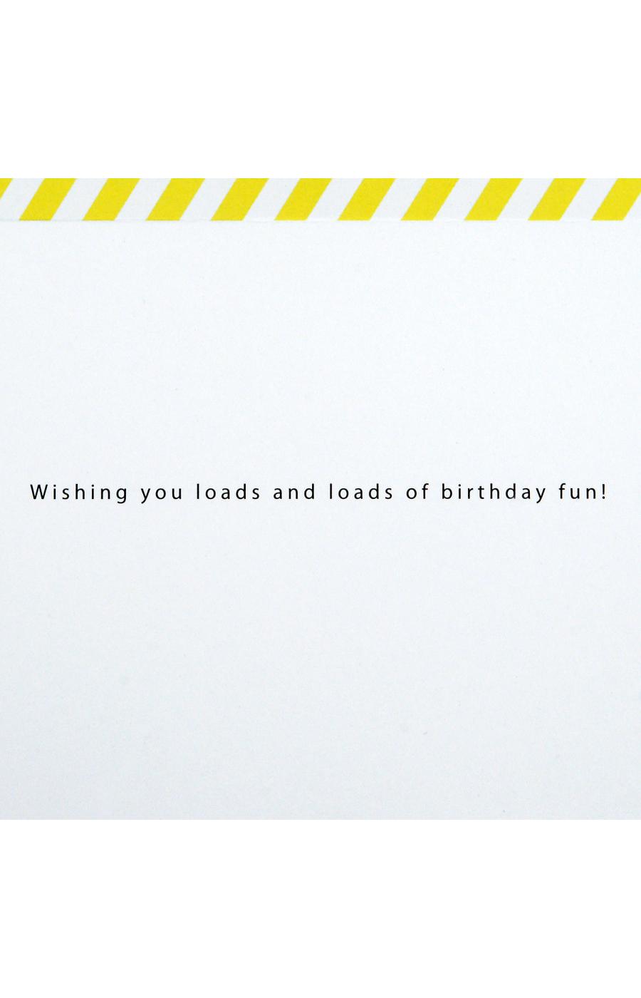 - Front features 3D trucks and construction equipment carrying birthday treats and presents, and reads: "Happy birthday." Inside reads: "Wishing you loads and loads of birthday fun! "