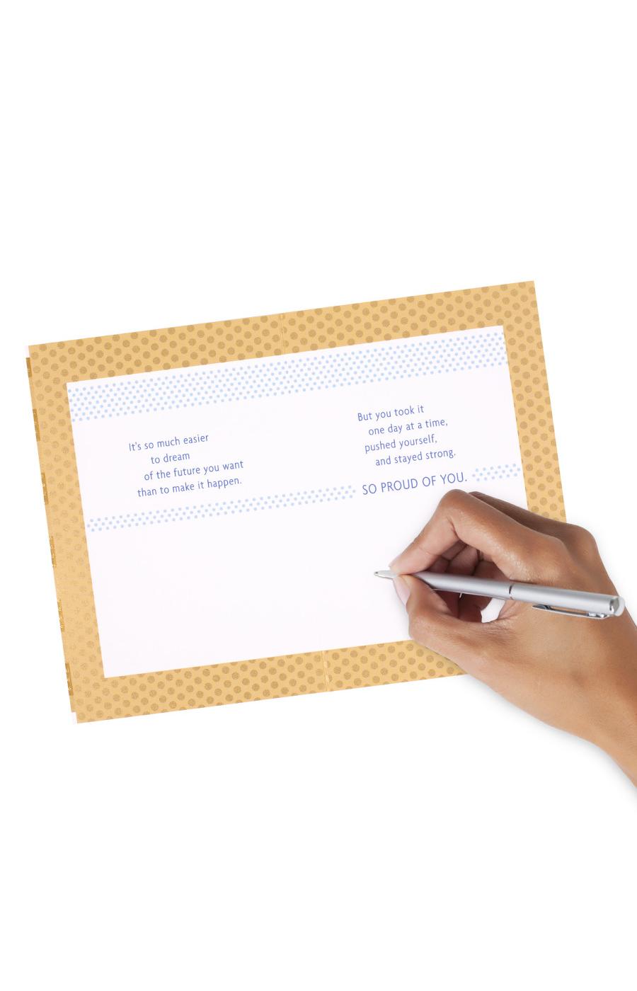 - Cover features gold foil stripes and a "You did it!" starburst. Inside reads: "It's so much easier to dream of the future you want than to make it happen. But you took it one day at a time, pushed yourself, and stayed strong. So proud of you."