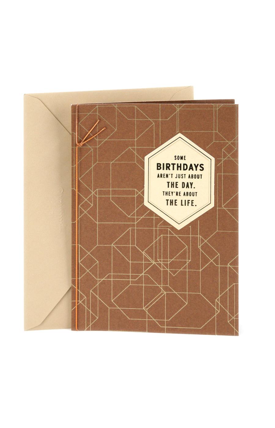 - Cover features a gold geometric pattern and metallic cord with foil lettering that reads: "Some birthdays aren't just about the day. They're about the life." Inside reads: "Celebrating yours. Celebrating you."