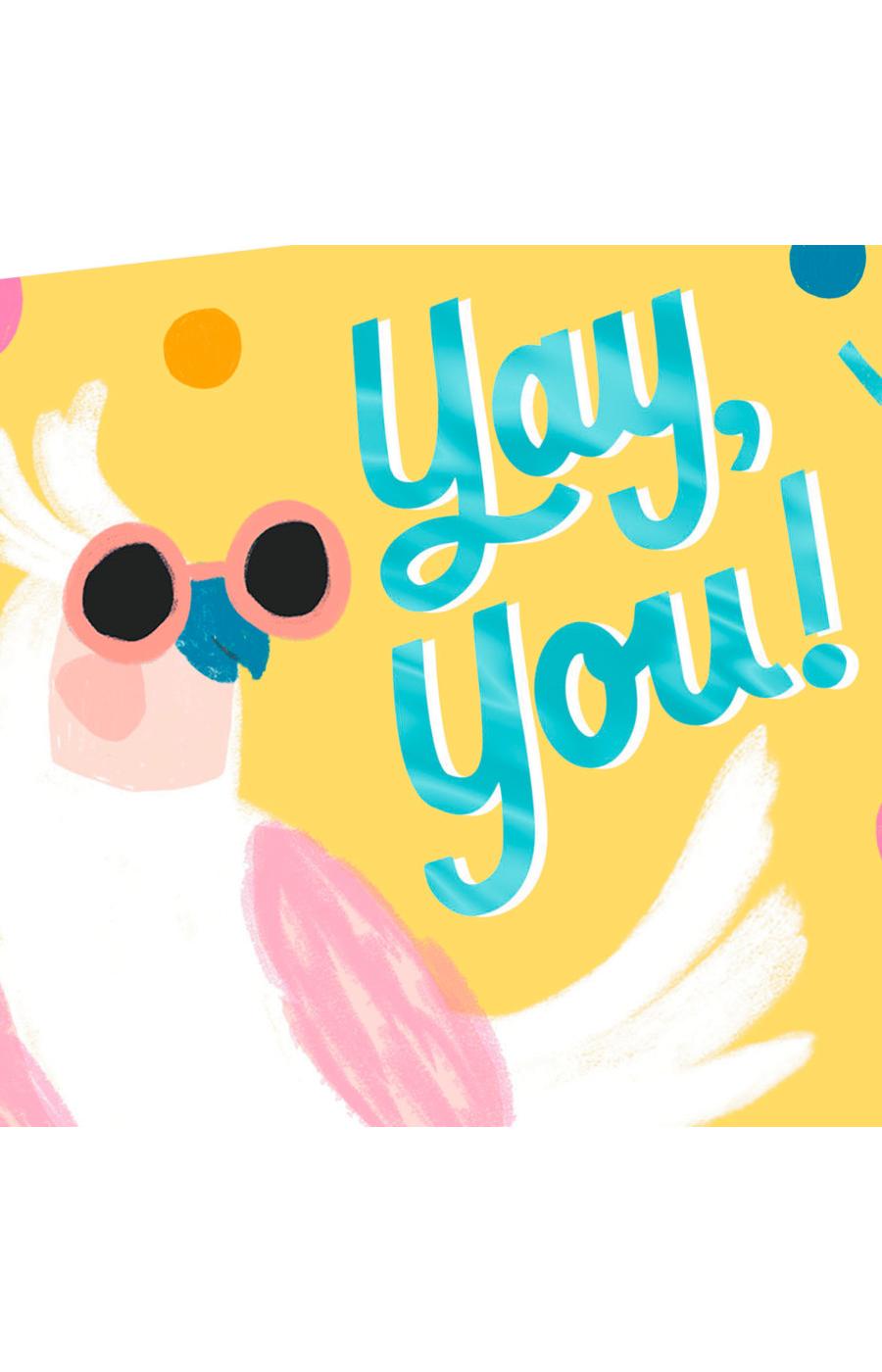 - Card cover features a cockatoo in sunglasses, metallic foil accents, and "Yay, you!" lettering. Inside reads: "This calls for some serious celebrating!"